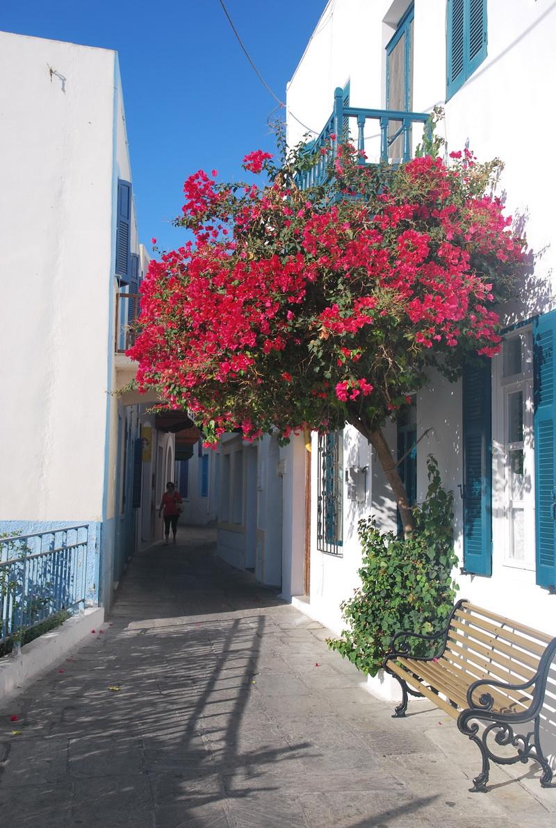 Etrafta kimsecikler yok. Sessiz terkedilmiş bir yerdeyiz sanki. Benim Nysiros’ta en fazla sevdiğim bu sakinliği oldu. Her şey özenli. Daracık bir sokakta yürüyorsunuz, rengârenk çiçeklerin taştığı bir balkon görüyorsunuz.