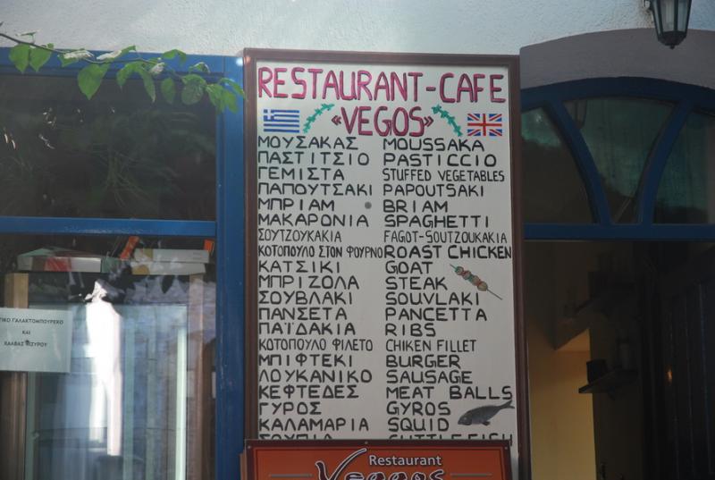 Buradaki kafelerin birinde oturup kahve içiyoruz. Bu arada karşımızda duran tabelaya bakarak Yunan alfabesini çözümleme çalışmalarına başlıyoruz. Aslında biraz üzerinde kafa patlatılsa çok rahat anlaşılabilir.