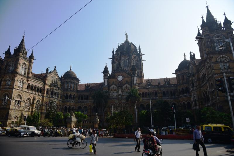 Sabahtan otelimizden çıkıp bir taksi kiraladık ve Merkez Tren İstasyonu’na (Central Railway) gittik. Dünyanın en güzel, en büyük ve en kalabalık tren istasyonlarından birisi. Unesco Dünya Kültür Mirasları listesinde de bulunan bu yerde işe gidiş saatine denk geldiğimiz için kısa bir süre bir yerlere ulaşmaya çalışan insan selini izledik. Sanki karınca yuvasından çıkan karıncalar misali buradaki insan kalabalığı. İnsan o kalabalığı görünce hemen gezi arkadaşlarını kaybetmemek için gözünü dört açıyor. Çıkışta gözümüze çarpan İngiliz mimarisinin eserleri olduğu hemen belli olan binaları izleye izleye bir süre yol aldık. Hint - Gotik mimarisinin iki ürünü olan üniversite binası ve Rajabai Kulesi kütüphanenin üzerinde değişik bir ambiyans oluşturmakta. Yüksek Mahkeme Binasında ise “adalet ve af” heykelleri dikkatleri çekiyor.