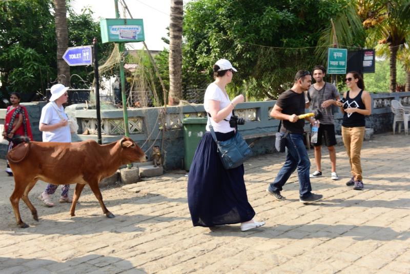 1 saatlik deniz yolculuğunun ardından adaya geldik ve gelir gelmez oyuncak bir tren ile 10 Rupi’ye adanın girişine gittik. 7. Yüzyıldan kalma oymacılık ile yapılmış mağaralar ve Shiva Heykeli etkileyici. Birçok Hindu bizimle beraber gelip bu taş kalıntılarına dua ediyorlar. Oyuncak trenden indiğimizde mısır közlemesi alıp elimize o güzel yokuşu çıkmaya başlayacaktık ki, bizi inekler kovalamaya başladı. Elimizdeki mısırları alabilmek için onlar kovaladı ben kaçtım, Resul Abi de durumu fotoğrafladı. Sonunda acele acele yiyerek sömeklerini ineğe verdim ama zaten onlardan kurtulsam bile az ileride elimden maymunlar kapacakmış. Birçok kişinin elinde olan yiyecekleri ani hareketlerle kapıveriyorlar çünkü. Adada dik yokuşu çıkamayan turistler için dört kişinin omuzlarında çıkardıkları “kral tahtı hizmeti”de mevcut. Bu adaya gelmek için para, tren ile ada girişine gitmek için para, oradan tekrar içeri girmek için para, fotoğraf çekmek için para…