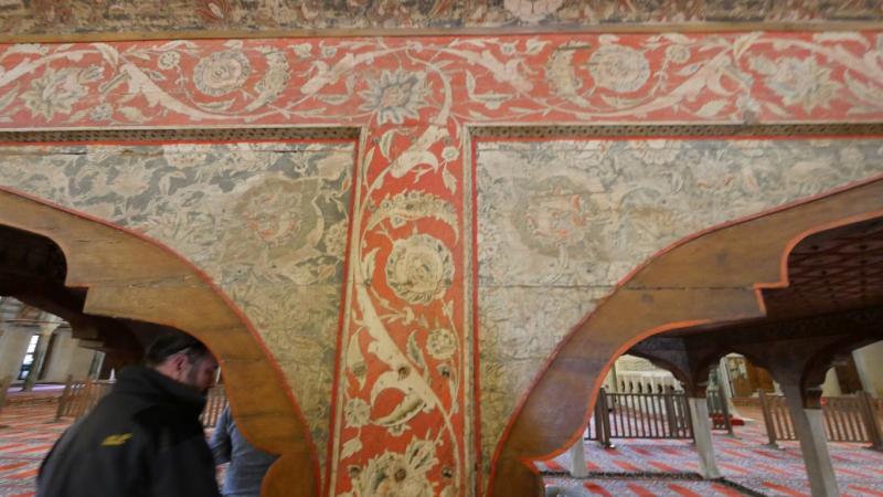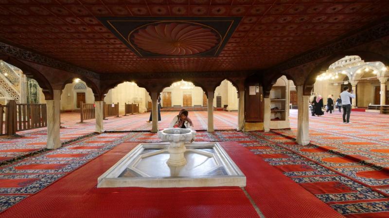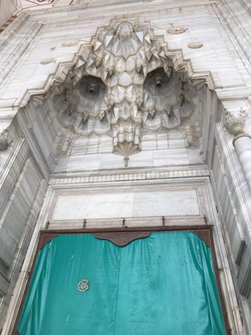 Öncelikle Cami’nin dışını keşfetmeye başlıyoruz. Üç renkteki sütunlar (yeşil, kırmızı, kum rengi) farklı yerlerden getirilmiş, yekpare parçalar. Mısır’dan, Kavala’dan getirilmiş olan sütunlar var. Bunlar toprağın 5-6 metre altına kadar gidiyorlarmış. Sütunların bağlantı yerlerinde kazınmış lale motiflerini görüyoruz.