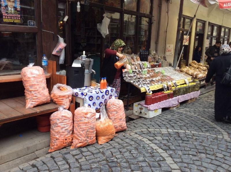 Beypazarı denince aklıma bir de havuç gelecek artık, elbette havuçtan bahsetmeden olmaz. Yürüdüğümüz yol boyu bol bol havuç ve havuç suyu sıkan tezgâhlar görünce merak ettim sordum, meğer burası havuç cennetiymiş; şehir meydanındaki havuç heykeli de bunun kanıtı… Her köşede havuç ve havuç suyu satılmakta, bardağı da inanmayacaksınız ama sadece 50 kuruş. Yine her köşede bulabileceğiniz karadut suyu da gittikçe azalan karadut ağaçlarının burada oldukça bol olduğunu gösteriyor.