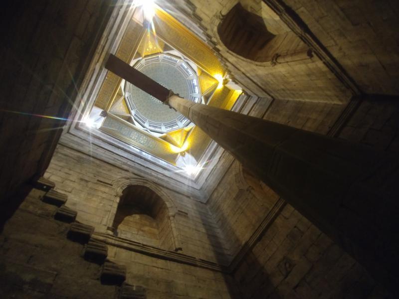 Tırmişlerimi yiye yiye kale kapısına geldim. Giriş için 100 LE (21,5 TL) verdim. Kale alanı çok büyük girişte okuduğuma göre İslami coğrafyadaki en büyük kale alanına sahipmiş. İlk görülen eser Muhammed Ali Camii, bizim Türkiye’deki camilerle aynı mimariye sahip onun için çok ilgimi çekmedi açıkçası. Türkiye’de herhangi bir büyükşehirde bunun aynısını hatta daha güzelini görebilirsiniz. Oradan sonra yolun sağında farklı bir mimariye sahip yazlık bir camii olan Al Nasser var. Yazlık dememin sebebi kubbe yerine üstünün açık olması. Zaten girişte girer girmez namaz kılınacak alan başladığı için ayakkabıları çıkarıp giriyorsun. Fotoğrafta gördüğünüz ortadaki boşluk bizdeki camilerde kubbenin altına denk geliyor. Bizdeki camilerin avlusu gibi kenarları kapalı ortası açık şekilde tasarlanmış.
