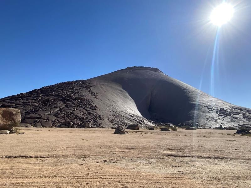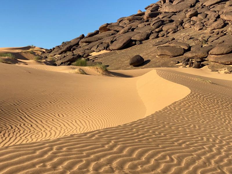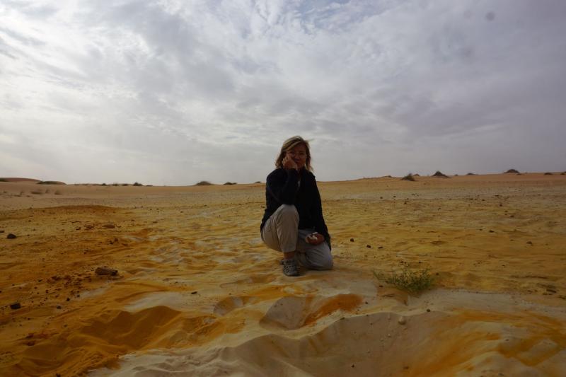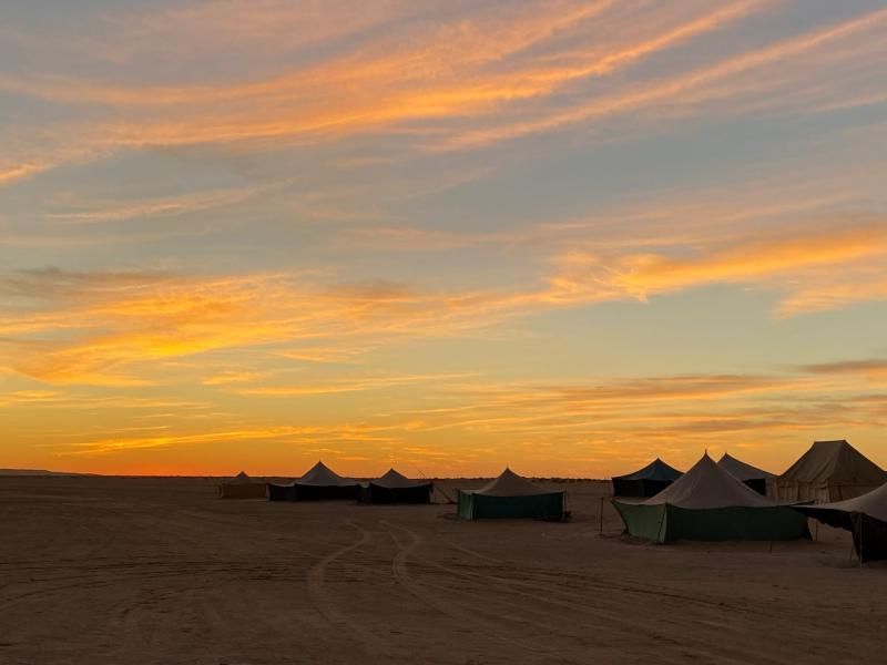 Sabah gezi boyu bizle olacak 4 x 4’lerle Azwega Vahası El Aouja vahasına doğru yola çıkıyoruz. 1932'de Fransız kolonisine karşı tarihi bir savaşın gerçekleştiği Oumoutounsi, bakır madenciliği rezervleriyle tanınan küçük Akjoujt kasabası, Amatlich kum tepeleri, Adrar dağları kordonu ve Legrara'dan sonra, bir serap gibi görünen karakteristik taş kulübeleriyle El Aouja, Azweiga vahasına varıyoruz. Personel önceden gelip dağın eteklerinde çadırlarımızı, wc ve duş çadırlarını kurmuş bile. Günün yorgunluğuna aldırmadan akşam yemeği hazır olana kadar, kolay olmasa da kum tepeye tırmanıyor gün batımını izliyoruz. Çölde şaşırtacak bir sunum ve lezzetli yemekler ve biraz sohbet sonrası, çöl yolculuğu yorgunluğu ile çadırlarımıza gidiyoruz.