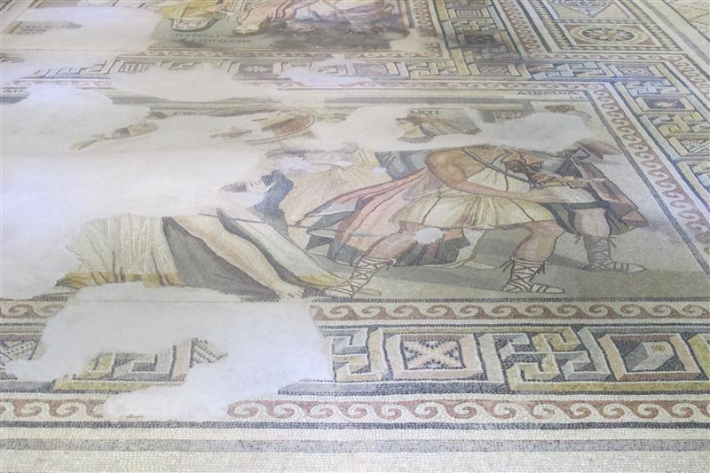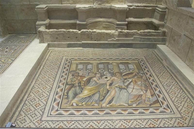321*326 cm. Savaşçı Tanrı Aşil'in Truva Savaşı'na götürülüşü tasvir edilmiş. Figürlerin çapraz işlenişi, çevresinin dalga motifi ile çevrili olması, üzerinin de yaklaşık 15 cm derinliğinde su ile dolu olması, döneminde figürlerin hareketli görünmesini sağlamıştır. Mozaiğin ortasında yer alan fıskiyeye, mozaiğin altından gelen kurşun boruların içinden su gelmekteymiş.