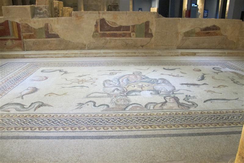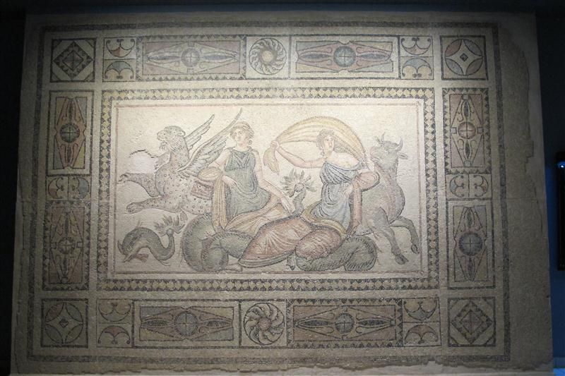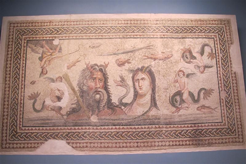 Zeugma kentinde Okeanos Villası diye adlandırılan villanın havuz taban mozaiği. 384*240 cm. Erken Roma dönemi. Kainata hayat veren evrensel ırmağın tanrısı Okeanos ve denizin verimliliğini simgeleyen eşi Tetis'in büstü, çevrede ise yunuslara binen Eroslar ile oltasıyla balık avlayan Çoban Tanrısı Pan bulunmakta.