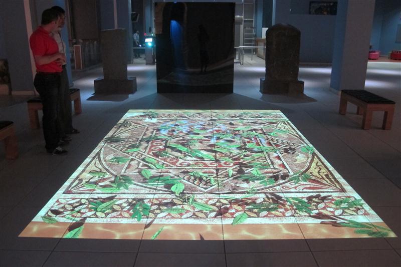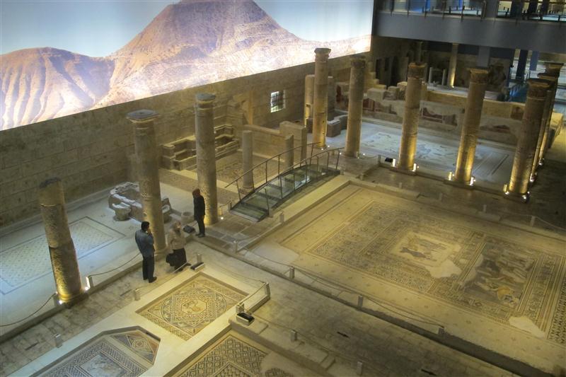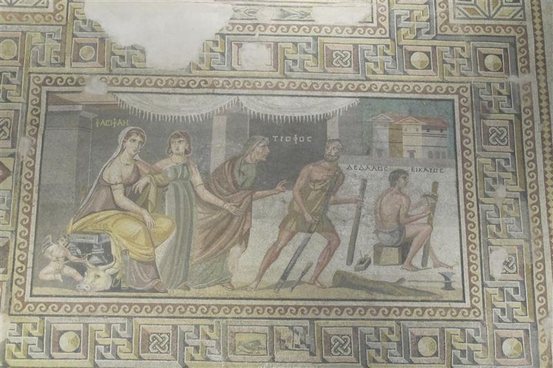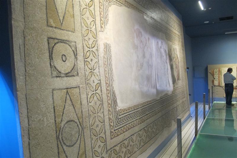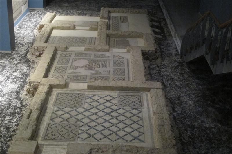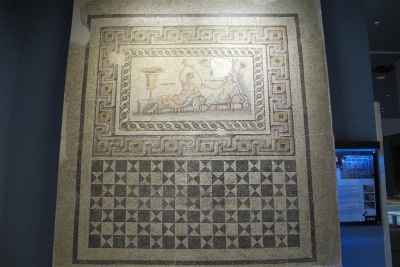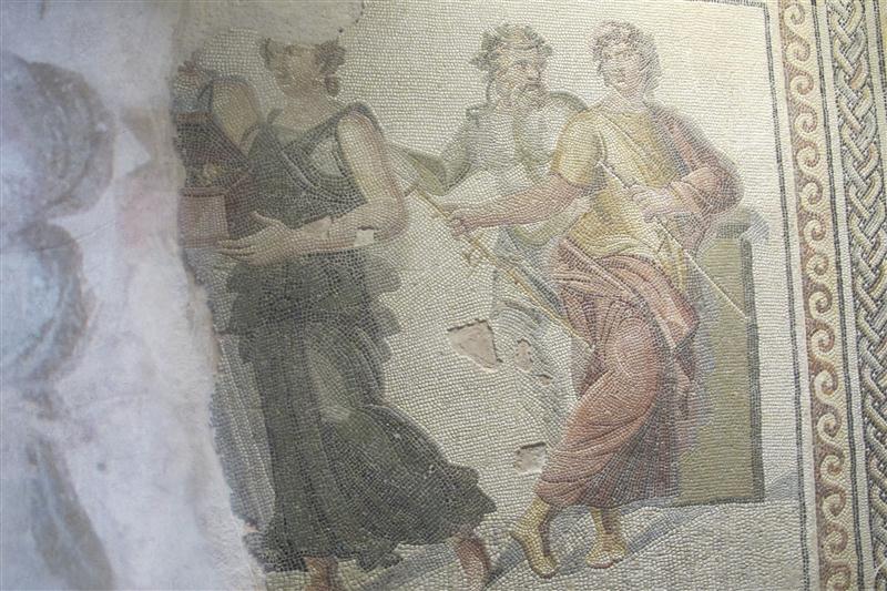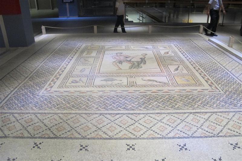 758*384 cm. Erken Roma Dönemi. 1998 yılında bulunan ve o yıl teşhir edildiği yerden büyük bir bölümü çalınan mozaiğin parçaları bugüne kadar bulunamamış. Eksik parçalar ışık oyunu ile mozaiğe yansıtılmış ve bir bütün olarak tasvir edilmesi sağlanmış.