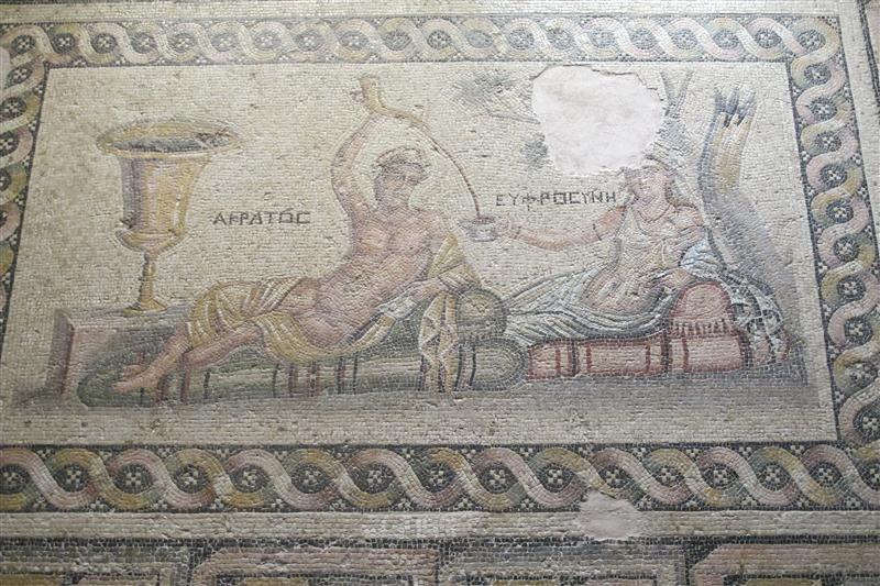 Akratos ve Euphrosyne klineye oturmuş, tanrısal içkiyi içmekteler. Ellerindeki bereket boynuzu ile tasvir edilen mozaik 1998 yılında bulunmuş ve M.S. 3. yüzyıl yapımı.