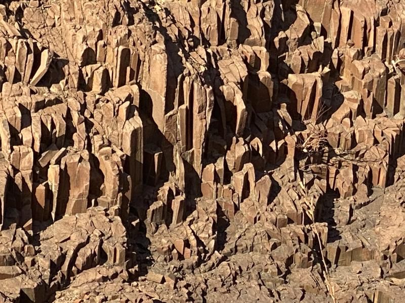 Uzun bir çöl yolculuğu sonrası ilerideki kaya dağ oluşumuna doğru ilerliyoruz. Araçtan inip otele doğru sivri yüksek kayaların arasında ilerliyoruz ve karşımızda kaya dağların eteklerinde kurulmuş müthiş bir “lodge” beni yine şaşırtıyor. Hemen yakınında bulunan UNESCO Dünya Kültür Mirası Listesi'ndeki Twyfelfontein Kaya resimlerini geziyoruz.