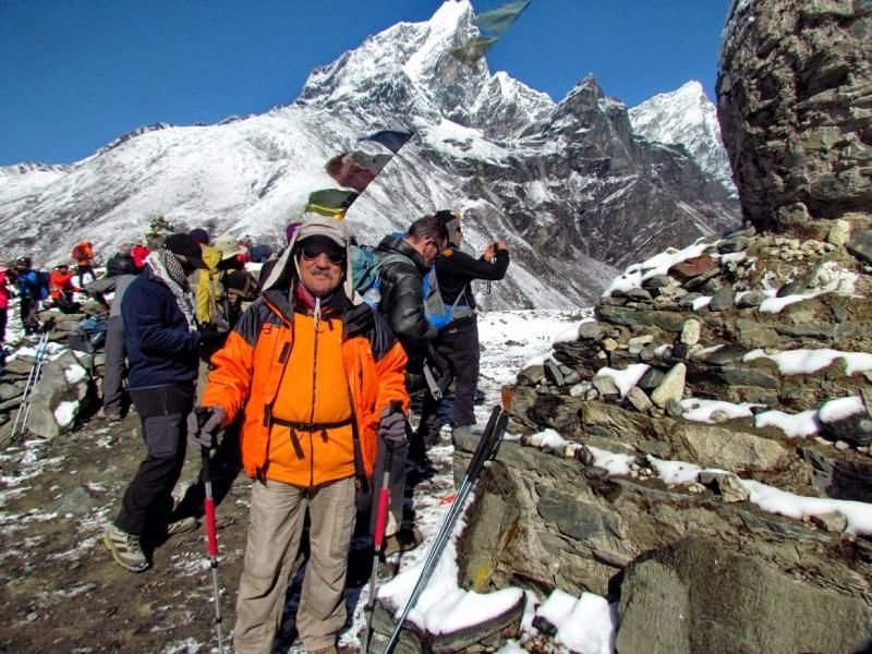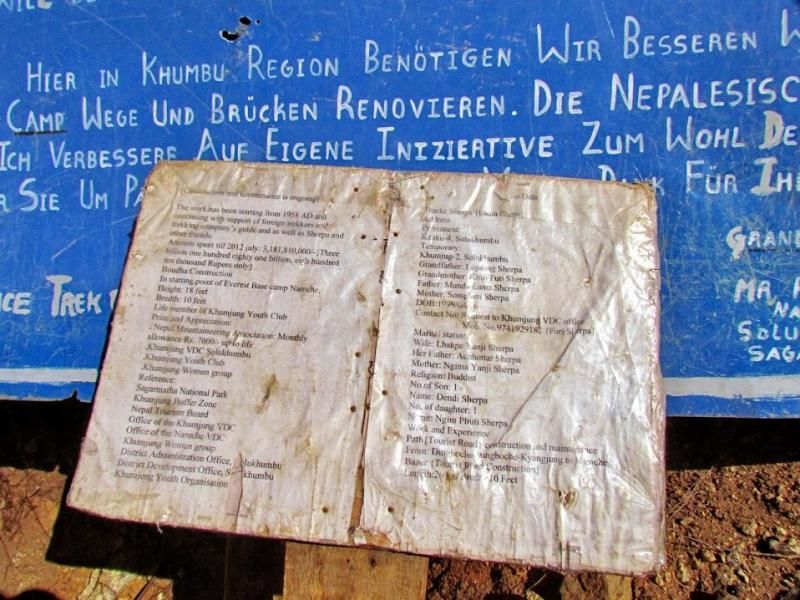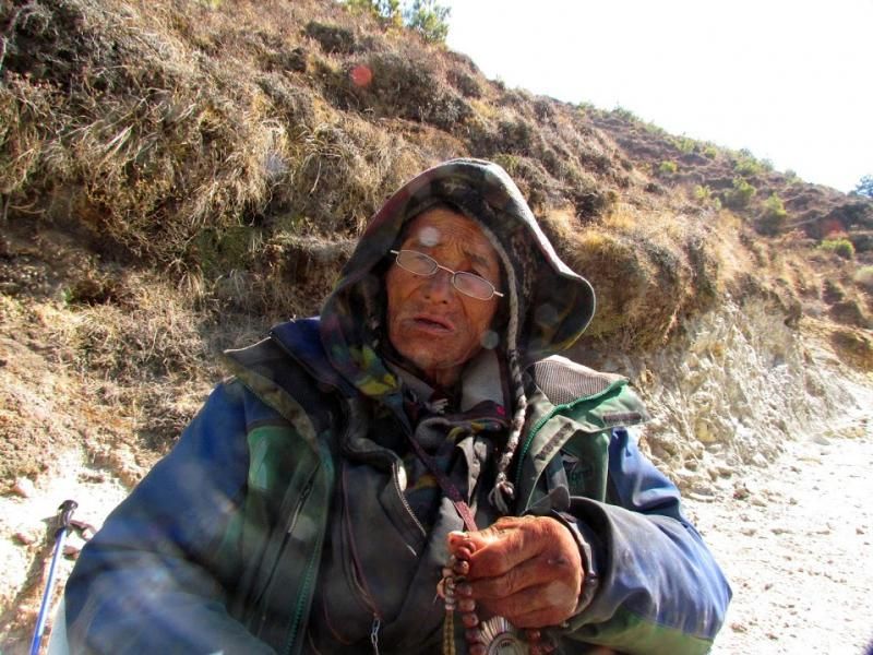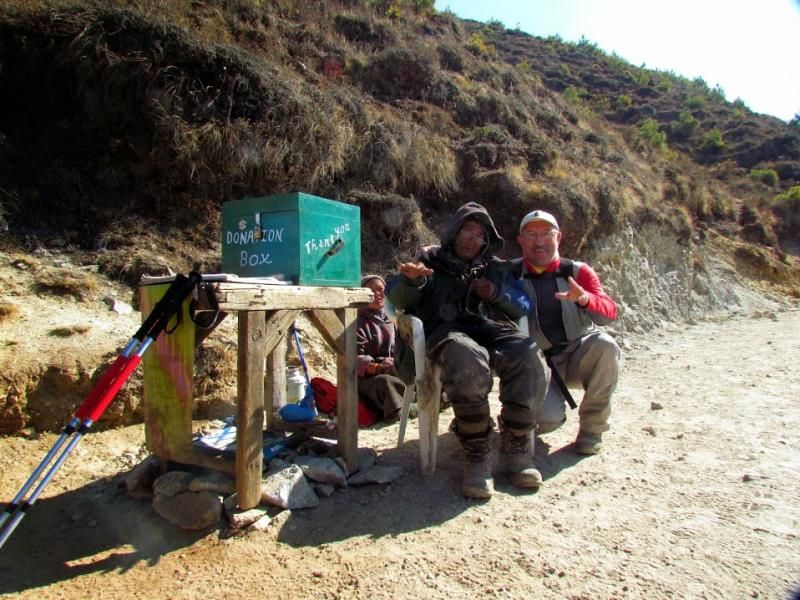 Aaaa… Bu arada önemli bir ayrıntıyı atladığımı fark ettim! Everest Ana Kamp’tan Lukla’ya kadar olan yolun bakım ve onarımı için bağış toplayan ve 5 yıl önce fotoğraflarını çektiğim yaşlı Pasang Lama Şerpa hâlâ görev başında… Daha bir çökmüş ama aynı heyecanla bağış toplamaya devam ediyor. Birkaç kare fotoğrafını çektikten sonra yanına çömeldim birlikte fotoğraflarımızı çektirdim. Tabii 400 rupilik bağışımı da yapıp bağış defterime 5 yıl önce olduğu gibi adımı kaydettim.
