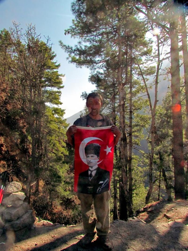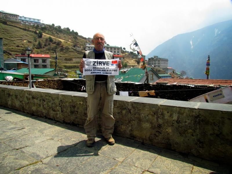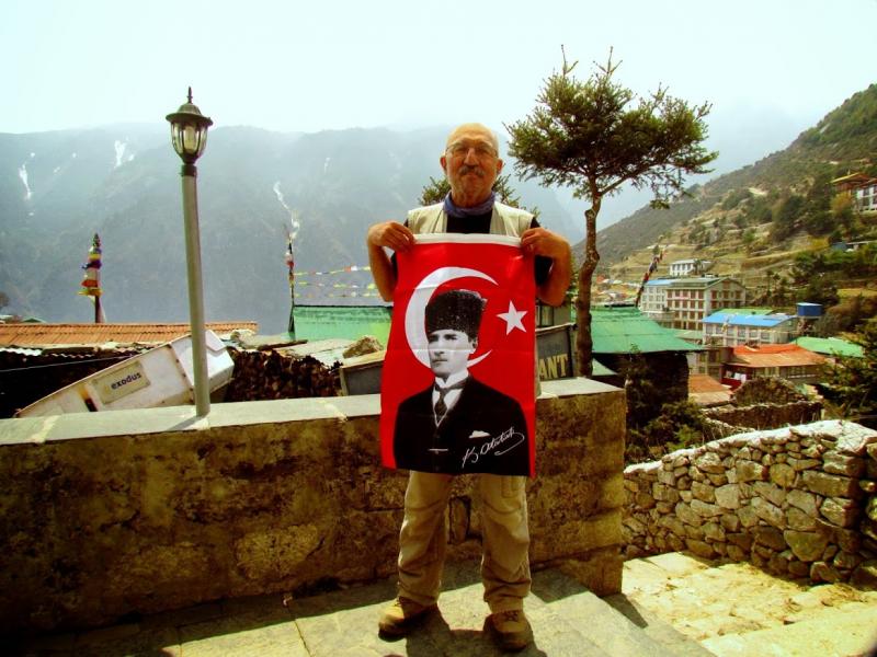 Namche’den ayrıldıktan kısa bir süre sonra Everest Seyir Terası’na ulaştım. Burada da Atam, bayrağım ve Zirvem ile fotoğraflar çektirdim. Sağda Lhotse Shar, solda Everest. Bu konuda biraz kafam karıştı zira Lhotse dediği Everest’e daha çok benziyordu, ama Rinji öyle olduğunu söyledi. Eh, çocuk işini biliyor tabii ki onun dediği doğrudur. Ayrıca değişik açılardan dağların zirveleri çok farklı görünebiliyorlar.