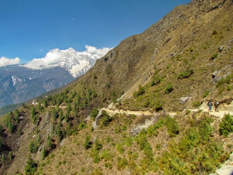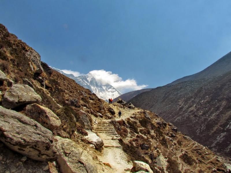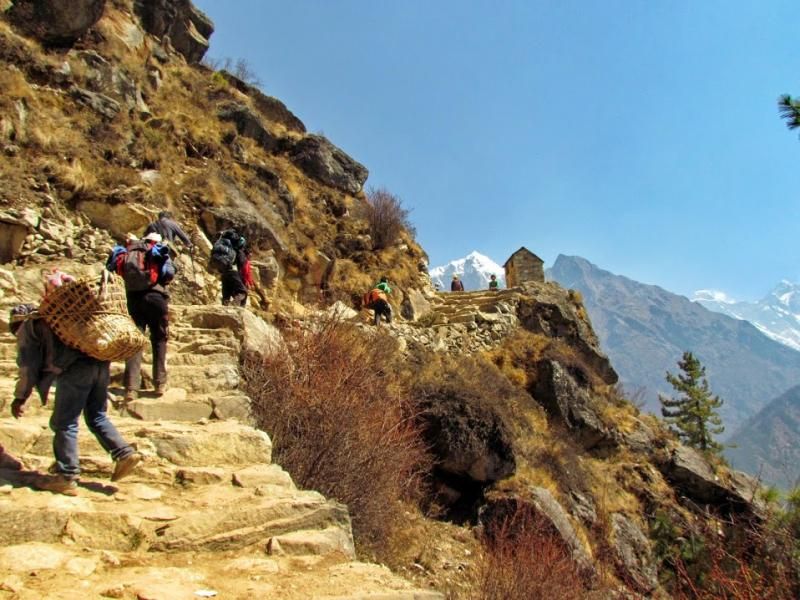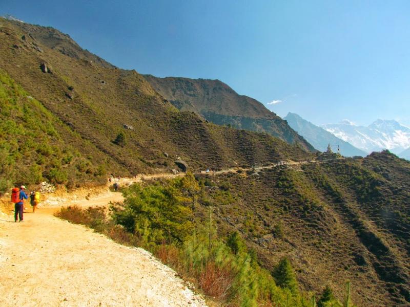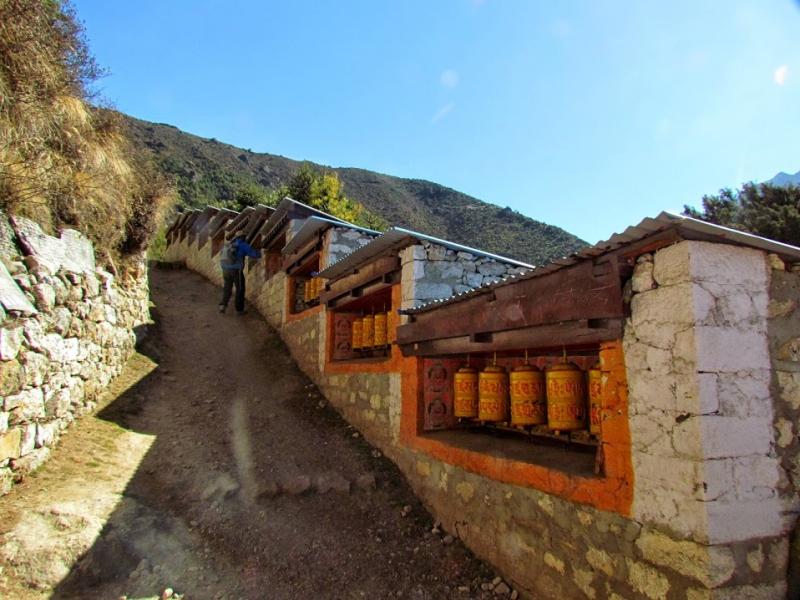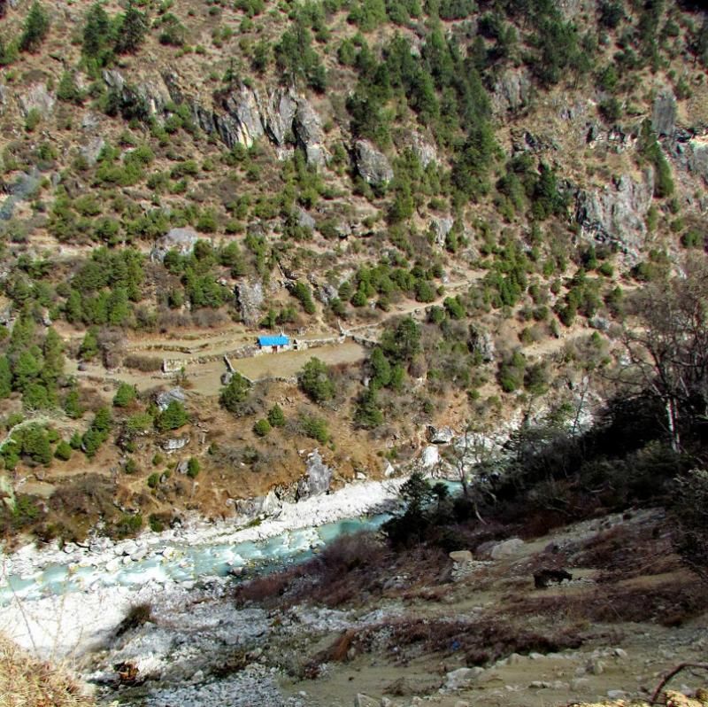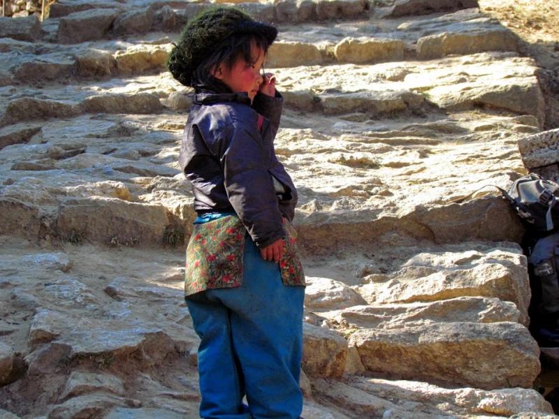 Khumjung’tan sonra biraz yolu uzatıp güzel bir manzaraya tanık olmamı istemiş Furwa, fakat o rotanın daha zorlu olacağını söyledi. Okulun hemen yanından doğrudan güneye giden yolun daha kolay olduğunu da ekledi. Önce bir düşündüm, hadi uzun ve zorlu yol dedim ama 15-20 adım sonra, “Şaka yaptıııım! Haydi, kolay yola!” diyerek güneye yöneldim. Bir bakıma iyi ki de öyle yapmışım çünkü inişin çoğu yeri basamaklı idi. Basamaklar da insanın dizlerini bayağı zorluyor.