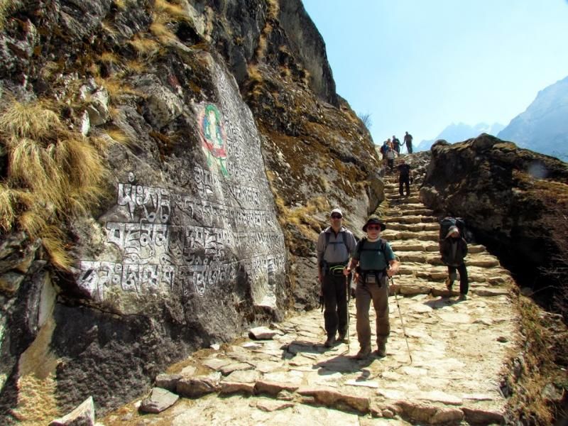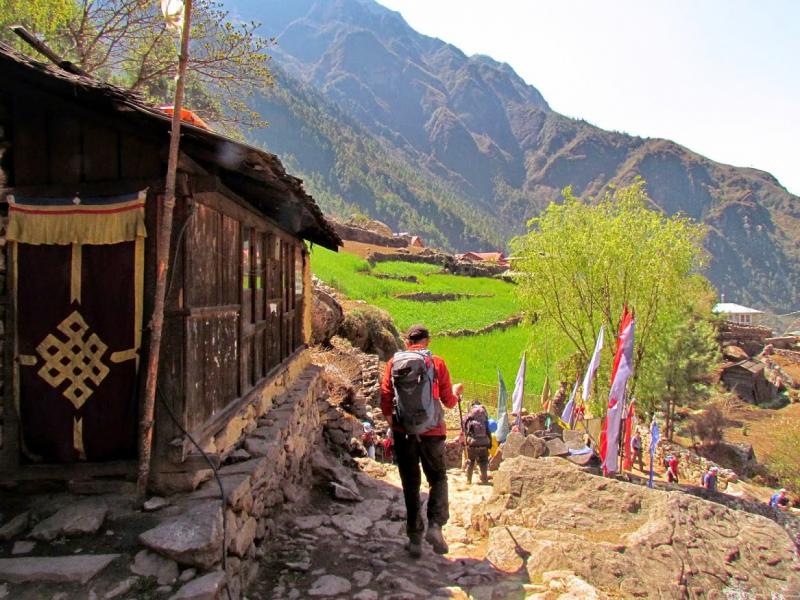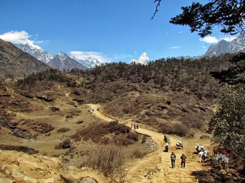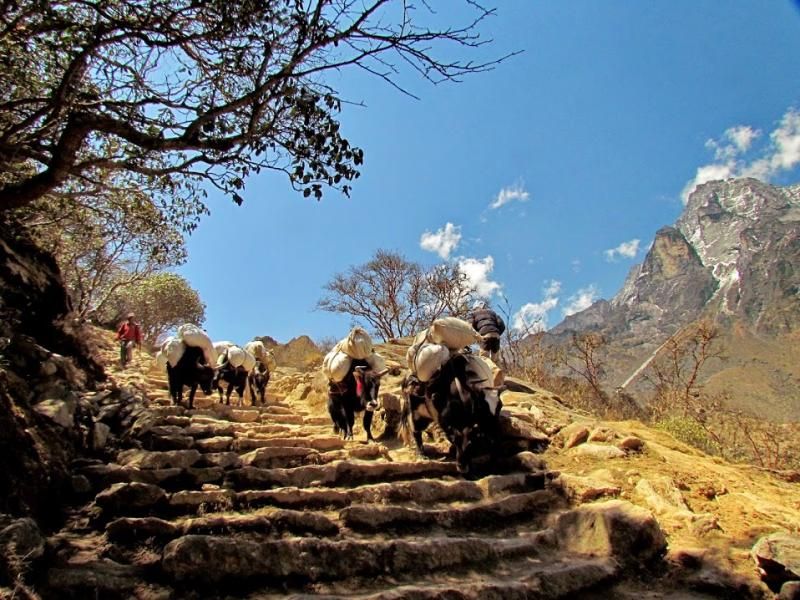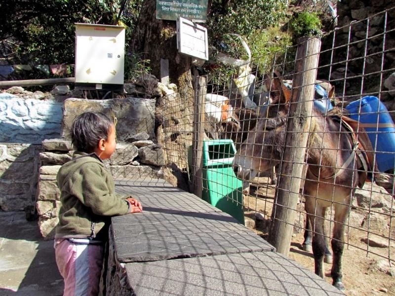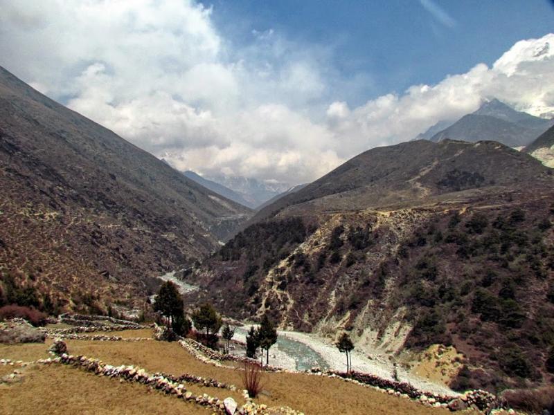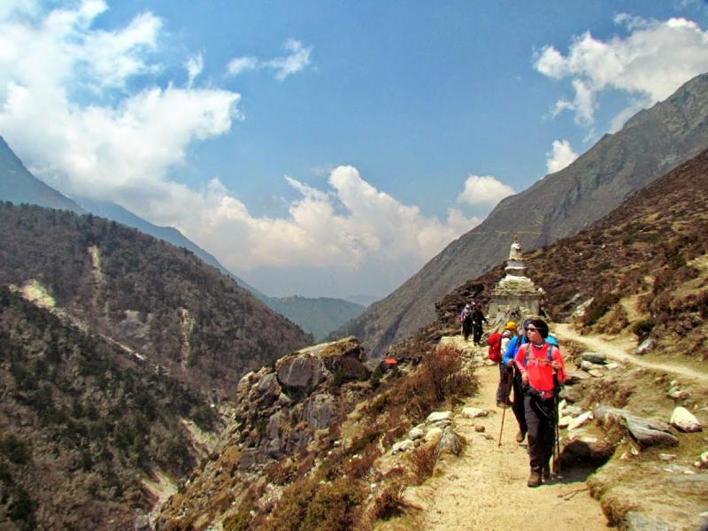 Khumjung’tan sonra biraz yolu uzatıp güzel bir manzaraya tanık olmamı istemiş Furwa, fakat o rotanın daha zorlu olacağını söyledi. Okulun hemen yanından doğrudan güneye giden yolun daha kolay olduğunu da ekledi. Önce bir düşündüm, hadi uzun ve zorlu yol dedim ama 15-20 adım sonra, “Şaka yaptıııım! Haydi, kolay yola!” diyerek güneye yöneldim. Bir bakıma iyi ki de öyle yapmışım çünkü inişin çoğu yeri basamaklı idi. Basamaklar da insanın dizlerini bayağı zorluyor.