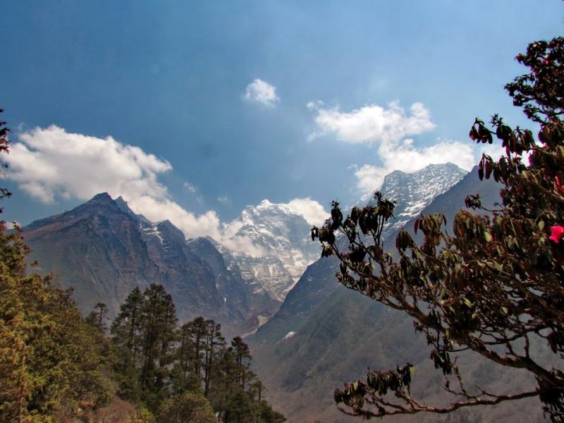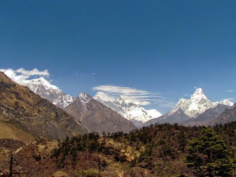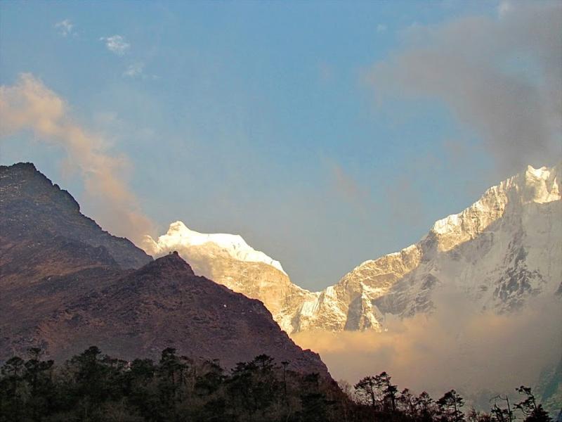 Keyfim inanılmaz gıcır : ) Ağır ağır ben bu yolu, hatta tüm etkinliği tamamlarım. Çam ormanları arasında ara ara Ama Dablam ve Kangtega [Tibetçe’de eyer demekmiş. Bazı açılardan bakıldığında gerçekten eyere benziyor] karlı zirveleri ve onları çevreleyen bulut deniziyle harika görüntüler sergiliyorlar. Sürekli tırmanıştayım artık… Nehrin olduğu yükseklik 3250-3300 metrelerde ve biz oradan 3860 metreye tırmanıyoruz. Önceki günlerin uyum tırmanışları olmasa gerçekten bitirmek zor… Ama yine de son 1 saat hiç ummadığım şekilde feci zorlanmaya başladım. Aralıksız tırmanıyorsun! İşte yukarıda da söylediğim gibi son saatte başladım, “Ne ulan bu! Ye-teeeer! Bir başınalık yetmez gibi bir de deliler gibi kendini yıpratıyorsun. Ye-teeer! Dön artık…” demelere ; ) Neyse ki hava çok güzel… Hatta önceki günler sıcak olduğu için kısa kollu tişörtlerle yürüdüğüm için kollarımı bayağı yaktığımdan, su bile topladılar, bugün uzun kolluyu giydim.