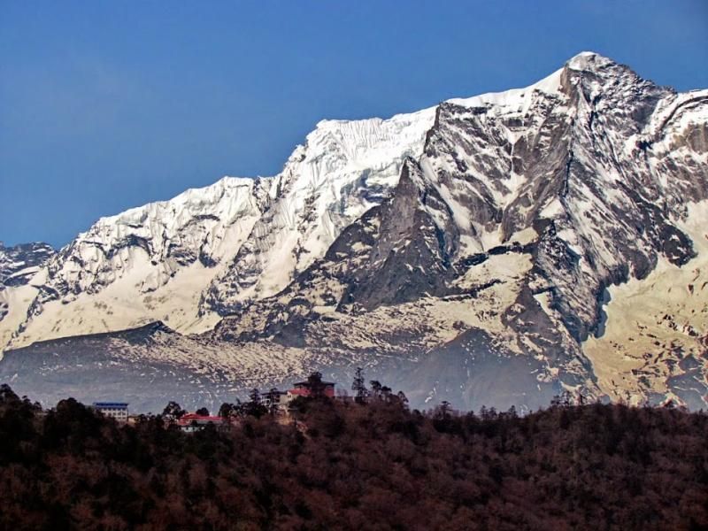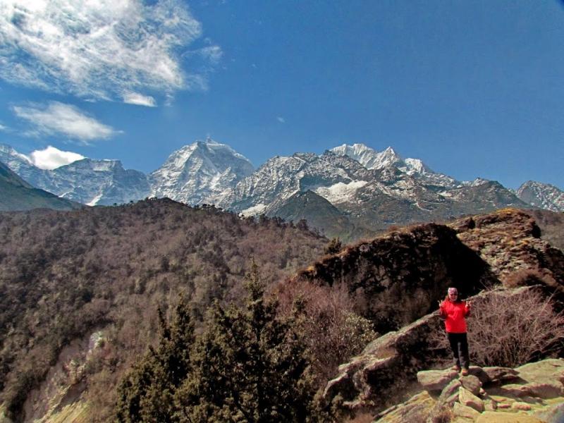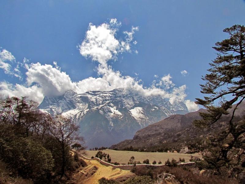 Bir önceki Everest Ana Kamp etkinliğimde Namche’de hava yine güneşliydi ama kaldığım 2 gün boyunca çevre dağları bulutlar kapatmıştı ve şu andaki harika görüntüleri benden saklamıştı. Ama bugün hava aşağılarda biraz puslu olsa da yukarılar pırıl pırıl… Otelden çıktığımızda tam karşımızda güneybatıya düşen, tüm heybeti ile bize tepeden bakan Kongde Ri (6187 metre)… Kasabadan biraz çıkıp arkamıza doğuya döndüğümüzde tüm güzelliği ile Kusum Kanguru (6.367 metre). Tibet dilinde bunun anlamı; dağın üç zirvesine gönderme yapan, “Kar beyazı 3 Tanrı” imiş. Bu dağ teknik gerektirmeyen doğa yürüyüşçülerinin tırmanabileceği bir dağ kategorisinde yer almasına rağmen 1978-1998 yılları arasında 22 tırmanış denemesinden sadece 9’u başarı ile sonuçlanmış. Onun kuzeyinde ise Thamserku (6.608 metre) yer alıyor. Bunun da Tibetçede anlamı, “Kar eyeri” imiş. Bazı açılardan bakıldığında atın üzerine koyduğumuz eyere çok benziyor.