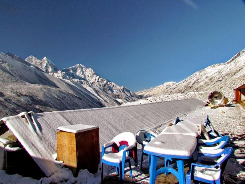 Ağır ağır sabah işlerimi halledip aşağıya kahvaltıya hazırlanırken kapı çaldı. Açtım, Rinji (daha sonradan benim rehberliğimi yapacak olan Mehmet’in rehberi) elinde bir kupa çayla kapıda. Çok mutlu oldum. Pek keyifli oluyor bu sabah sabah ayağa gelen çay… İşte başka ekspedisyonlarda bu tarz hizmetleri duyup sana aynıları yapılmayınca insan buruluyor. Bu sefer bazen sallasalar da beni mutlu edecek ufak tefek incelikler yapıyorlar şu ana kadar… Çay faslı bir yana, aslında Rinji’yi kapıda görünce şaşırdım, zira düşünceme göre Mehmet ile çoktan yola çıkmış olmaları gerekti. Mehmet tembellik yapıyor herhalde : )