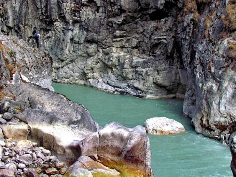 Dönelim parkura… Nehre geldik. Köprüyü aşıp karşı tarafa geçtikten kısa bir süre sonra bir çay evinde mola verdik. Köprü uzuncaydı. Altından gürül gürül akan nehir muazzamdı. Ara ara camgöbeği ve turkuaz iken birden köpürerek pamuk gibi oluyor ve suyun şiddetinin yıprattığı, aşınarak pırıl pırıl ve rengârenk olan kayaları okşayarak yoluna devam ediyor. Bu görüntüleri resmetmek gerçekten çok zor…