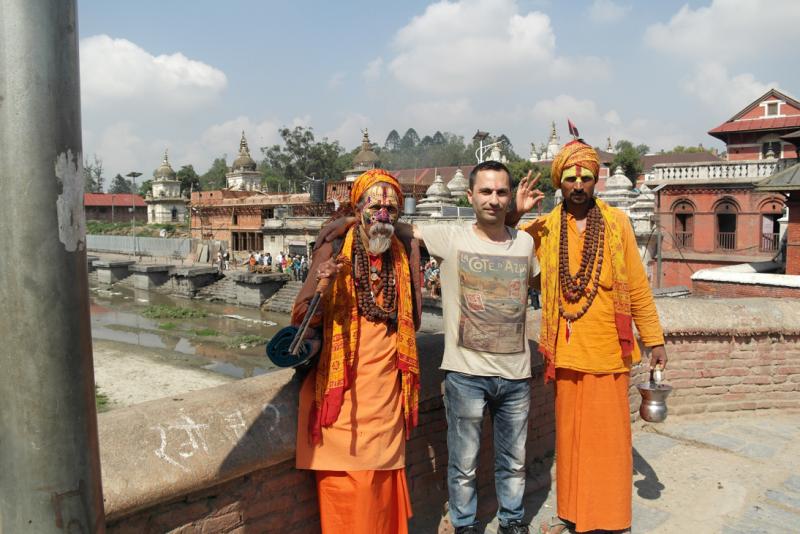 Sonrasında aynı tapınağın çevresinde yaşam süren, ülkedeki en üst makama sahip olan Sadular'ı ziyaret ettim. Renkli turuncu kıyafetleriyle dikkat çeken ve buradaki yanan ahşapların küllerinden faydalanarak vücutlarını beyaza boyalayan Sadular yani Hindu din adamları kesinlikle ve kesinlikle saçlarını ve sakallarını kesmiyorlarmış onlar için yıkanmak da günah sayılıyormuş. Hindu inancına göre öldükten sonra yakılmayan insanlar sadece Sadular, çünkü direkt olarak cennete gittiğini inanıyorlar.