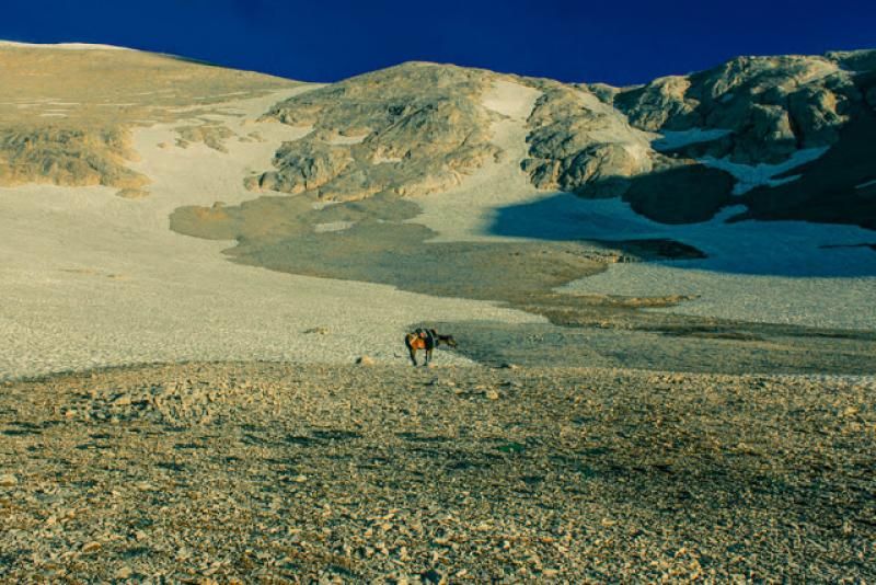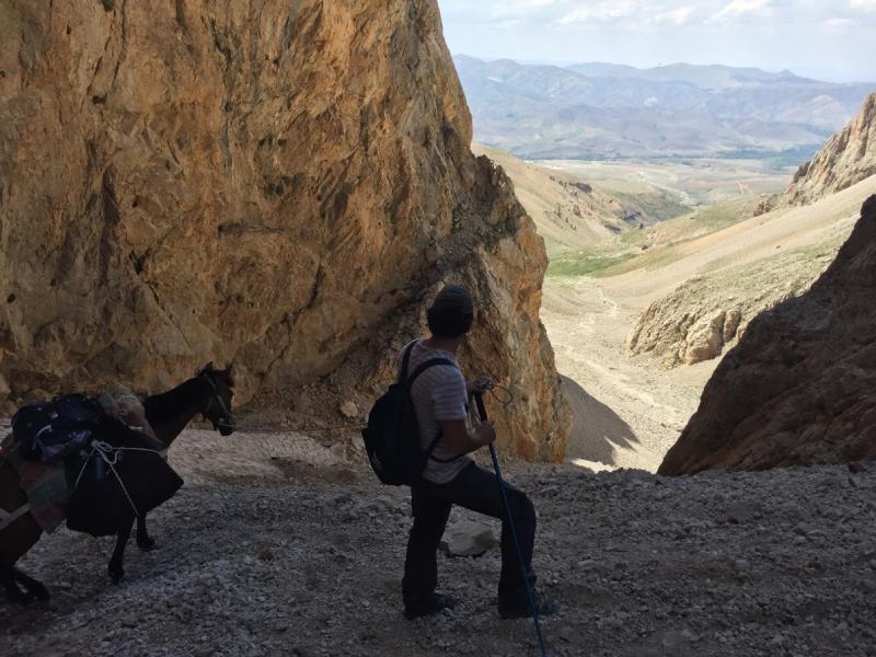 Eşyalar ve Düldül tamam, batonları aldık elimize başladık yürümeye. Yolların durumundan bahsedecek olursak; her yerde bol bol çarşak dedikleri keskin taşlardan var. Bunlar uzun süre kar altında kalan kayaların yaz sıcağına maruz kalmasıyla; ısı farkının çok olmasından kaynaklı kırılmasıyla oluşmuşlar. Ayakkabılar burada devreye giriyor işte. Taşlar yığıntı gibi çok olduğundan yürürken ayaklar kayıyor ve taşlar ayakları mahvediyor. Sert ve sağlam ayakkabı ayaklarınızı koruduğu gibi, hemen de parçalanmaz.