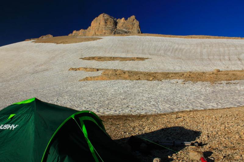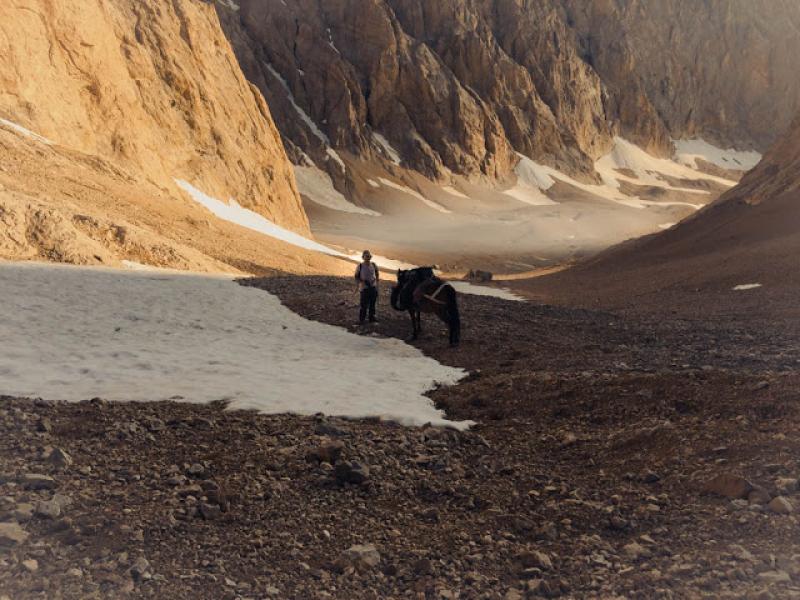 Neyse yolumuza devam edelim. Son tepeyi de aştıktan sonra kocaman plato karşımızdaydı. Son bir iniş yaptıktan sonra bir gölün kenarına yerleştik. Buraya kamp alanı diyoruz ama sadece kamp yapmaya müsait olan en iyi yer olduğundan. Yoksa alanda hiçbir şey yok. Su yerden çıkıyor, bunu kullanıyorsunuz. Küçük bir göl var ama orası hala kar ve buz kaplı. Çok büyük bir açık alan, yamacına saklanacağınız hiçbir yer yok. Yani demek istediğim kenarına konuşlanacağınız ne bir ağaç, ne bir kayalık var. Yani kabak gibi apaçık bir yere yerleşiyorsunuz. Düldülümüzden eşyaları indirdik ve kalan son enerji kırıntılarımızla çadırı kurup yerleştik. Açlık bir yandan yorgunluk bir yandan sersem gibiydik. Tabii rakımın 3.400 olması da bizi çarptı biraz. Hemen kamp ocağımızı yakıp su ısıttık ve birer çorba içtik, sonra kahve ve tatlı atıştırmalıklar ile enerjimizi az da olsa topladık.