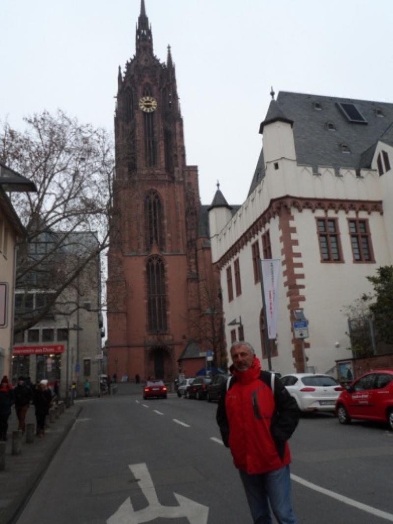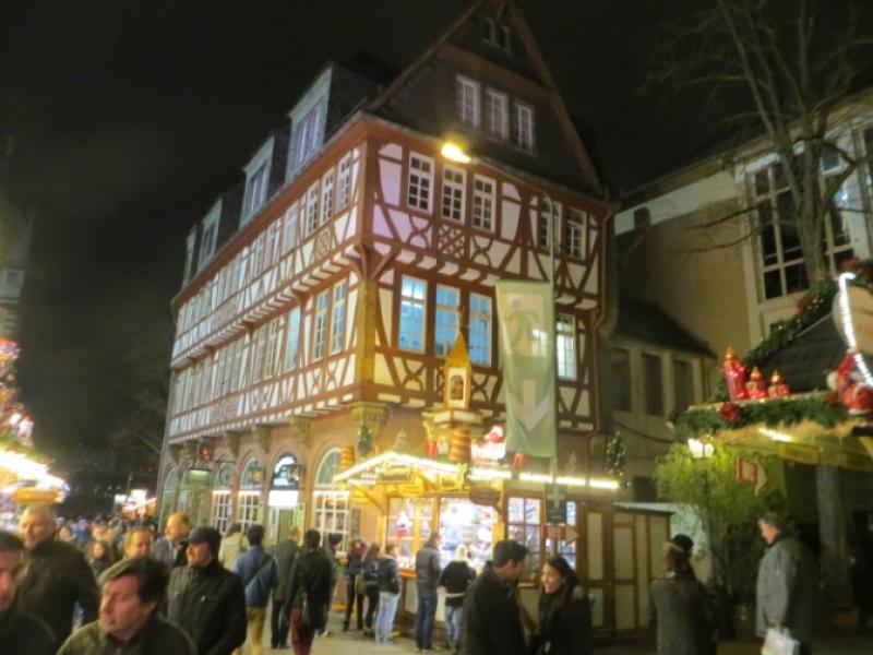 Şimdi önümüze, meydanın hemen yanı başında konuşlanmış, bence saklanmış olan meşhur Dom Katedrali çıkıyor. Ama çan kulesini hiçbir çuvala sığdıramamışlar. Her yerden görünüyor. İçerisini tabii ki ziyaret ediyor ve her kilise ve katedralde olduğu gibi bizimki yine mumlarını yakıyor. Sonrasında hemen yan sokakta nehre inen yol üzerinde yine meşhur 1479 yılından beri ayakta kalmış Haus Wertheym’a denk geliyoruz. E bu kargaşada bunun da önümüze çıkması ve restoranının içersine göz atmamın hatta fotoğraf çekmemin ilahi bir mesajı olmalı! Ancak bir seyahat bloğunda Frankfurt’un en pahalı ve en kötü yemek deneyiminin de burada olduğunu okumuştum. Onun için burada yemek işini atladım.