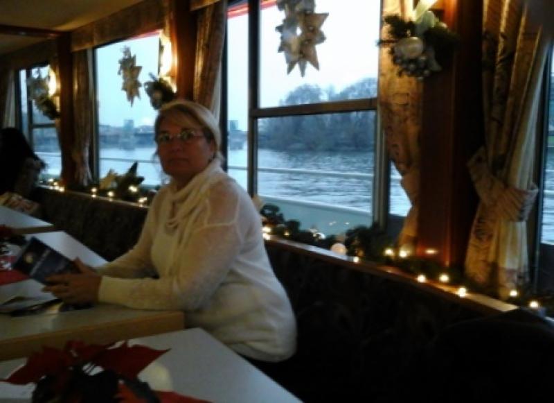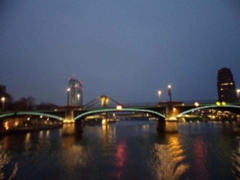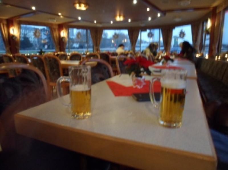 Şimdi nehir kıyısında demirlemiş nehir gezisi teknelerine gözümüz ilişiyor. Ee benim gibi bir cruise yazarının buraya kadar gelmişken hiç gemiye binmeden dönmesi düşünülebilir mi? Bilet gişesine gittiğimizde kış olması nedeniyle sezonun son seferinin 1 saat sonra kalkacağını ve mart ayına kadar ara vereceklerini söylüyorlar. 50 dakikalık bu kısa tur için hemen kişi başı 9€ ödeyerek biletlerimizi aldık. Bu turun 100 dakikalıkları da 14-15€ idi. Bir saat sonra geldiğimizde hemen tekneye aldılar ve alt katta sakin bir masada yerimizi aldık. Zaten yarı boş olan teknenin restoranında şöyle romantik bir akşam geçireceğimizin ilk işaretlerini hemen ortamın sıcaklığını gördüğümde almıştım. Ne de olsa bir kere kanıma işlemiş gemide olmanın rehaveti. Hemen birer bira siparişi ile Main nehri boyunca adeta bir kuğu edasıyla süzülerek gece manzarasının keyfine vardık. İyi ki yapmışız, size de tavsiye ederim. Kesinlikle, bilhassa bu akşam manzaraları seyretmeniz lazım.