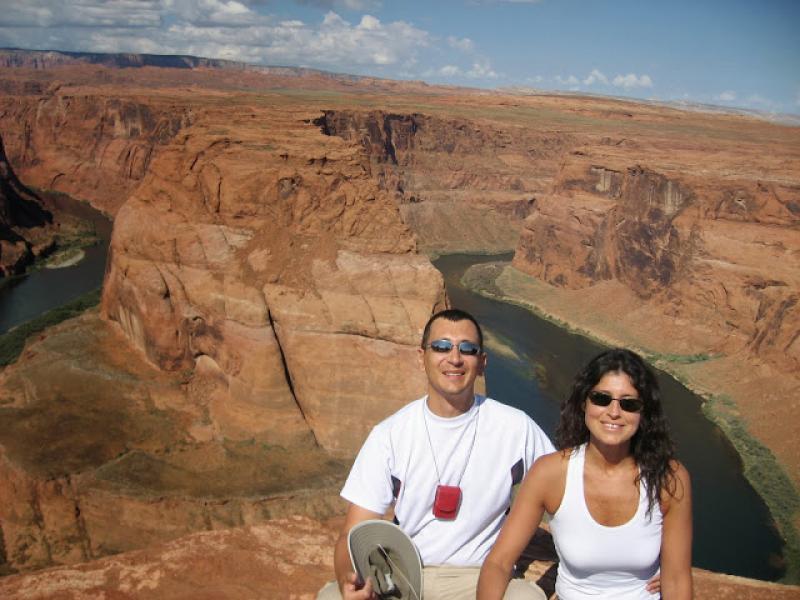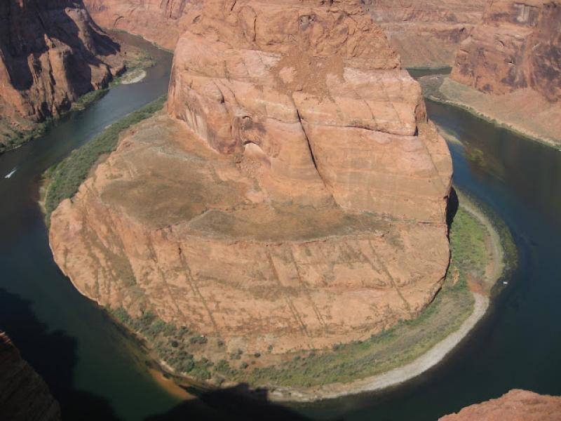 Powell Gölü yakınlarında ilk durağımız; Horseshoe Bend… Tepeden bakılınca görsel bir keyif veren, elle çizilmiş gibi harika bir kara parçası… At nalı şeklinde… Bir kara parçası düşünün; U harfi şeklinde bir su birikintisi oluşmuş, tepeden baktığınızda çok net görebiliyorsunuz. At nalı görüntüsü su yani… Vakit varsa görülebilir, yoksa büyük kayıp değil.