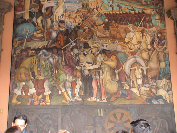 Duvarları süsleyen bu resimlerde, İspanyollar’ın Meksika’ya gelişi, Engizisyon mahkemelerinin kuruluşu ve Meksika tarihinin tüm ayrıntıları resmedilmiş. Altının çıkarılışı ve işlenişi, mısır tarlaları ve benzeri konular da resmedilenler arasında. Etkilenmemek mümkün değil.