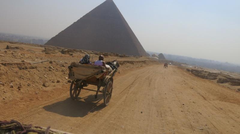 Piramitler bölgesine girmenin bedeli 80 EP (30 TL). İçeri girer girmez bir at arabası kiraladım ve bir rehber bana piramitlerin tarihçesini anlatmaya başladı. Piramitler hemen uzakta gözüme çarpsa da beni girişte Gize Platosu’nun bekçisi niteliğinde “korkunun babası” olarak bilinen büyük bir sifenks (kafası insan, gövdesi ise uzanan bir aslan şeklini alan heykel) karşılıyor. Piramitlere tırmanmanın yasak olduğunu tabelalardan anlasak da, rehber polise rüşvet vererek yarısına kadar tırmanabileceğimi bana söyledi. Ben de gerek olmadığını söyledim. At arabası ile 3 büyük piramidi turlamak için 70 EP (25 TL) anlaşmış olsam da tur bitiminde benden 200 EP istediler, vermedim.
