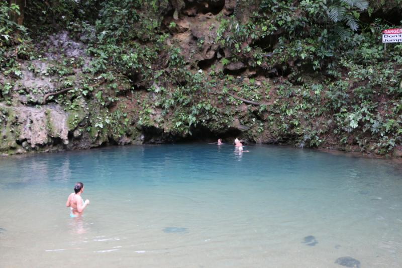 Yemek sonrası yerel rehberimiz ve şoförümüz sevgili Laselle ile Blue Hole’a geliyoruz. Burada en derin yer 75 fit. Bu delikte tüplü dalışlar yapılıyormuş. Burası aslında bir yer altı nehri. Bu nehir biraz önce gördüğümüz mağaranın içinde devam ediyor. Depremler neticesi bu bölgede büyük bir çöküntü olmuş ve Blue Hole oluşmuş.