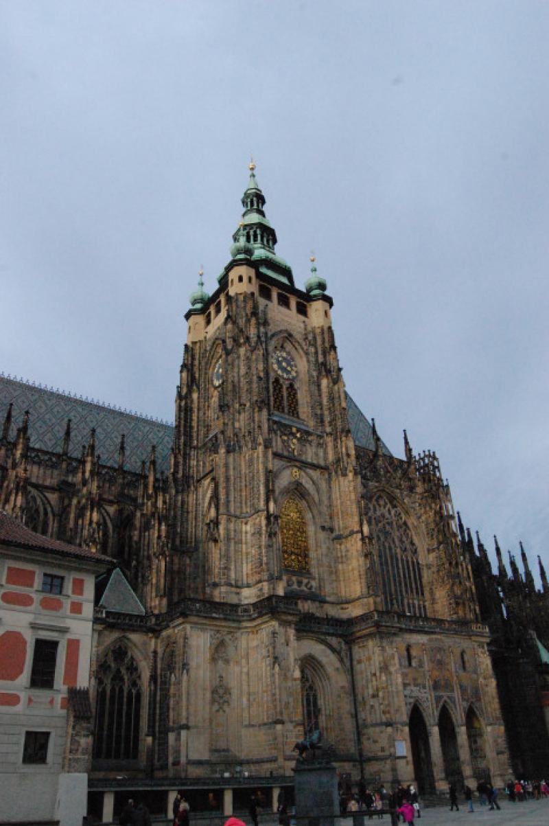 1344 yılında bir Fransız mimar sayesinde bu katedralin yapımına başlanmış ve katedral anca 1929 yılında bitebilmiş. Yaklaşık 585 sene yani :) Yapı, gotik ve barok yapımının bir araya gelmesiyle oluşmuş. Bir de katedralin üzerinde çirkin yüzlü heykeller bulunuyor. Normalde bu heykeller yağmurdan korunmak içinmiş fakat şeytan girmesin diye konulduğuna da inananlar varmış. Aslında bu yapı ile ilgili daha birçok teknik bilgi var; ama o kadarına gerek yok :) Sadece şunu diyeyim; St. Vitus Katedrali sizi Prag’a aşık eder. (Bu arada maalesef ki içine giremedik.)