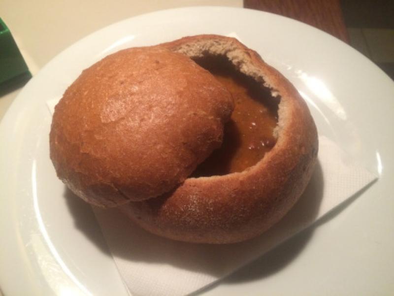 Biber, soğan ve patatesi bir araya getirip gulaş çorbasını oluşturmuşlar. Çorba ekmeğin içinde servis ediliyor. Tadını beğendim ama özleyeceğim bir tat olacağını sanmıyorum.