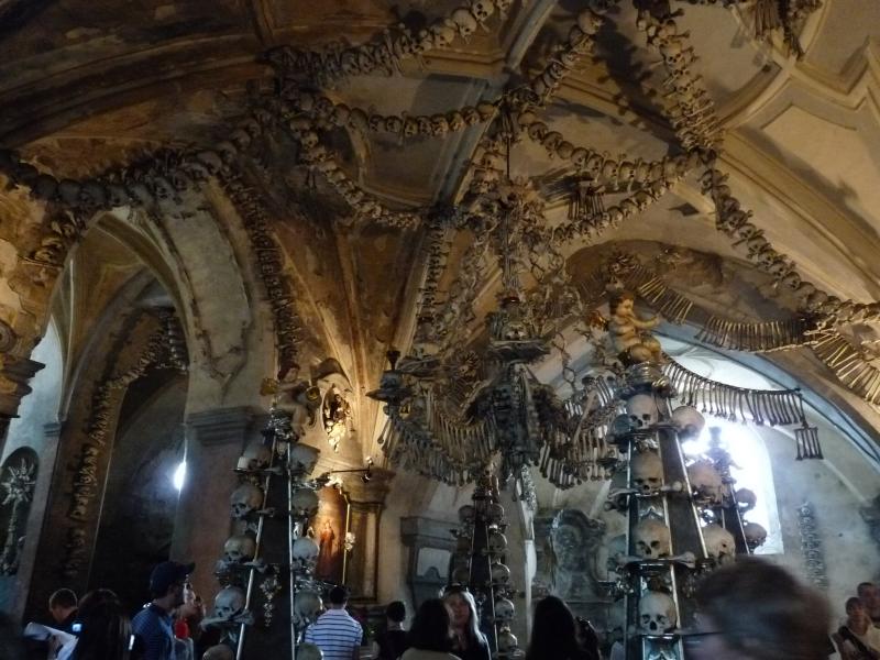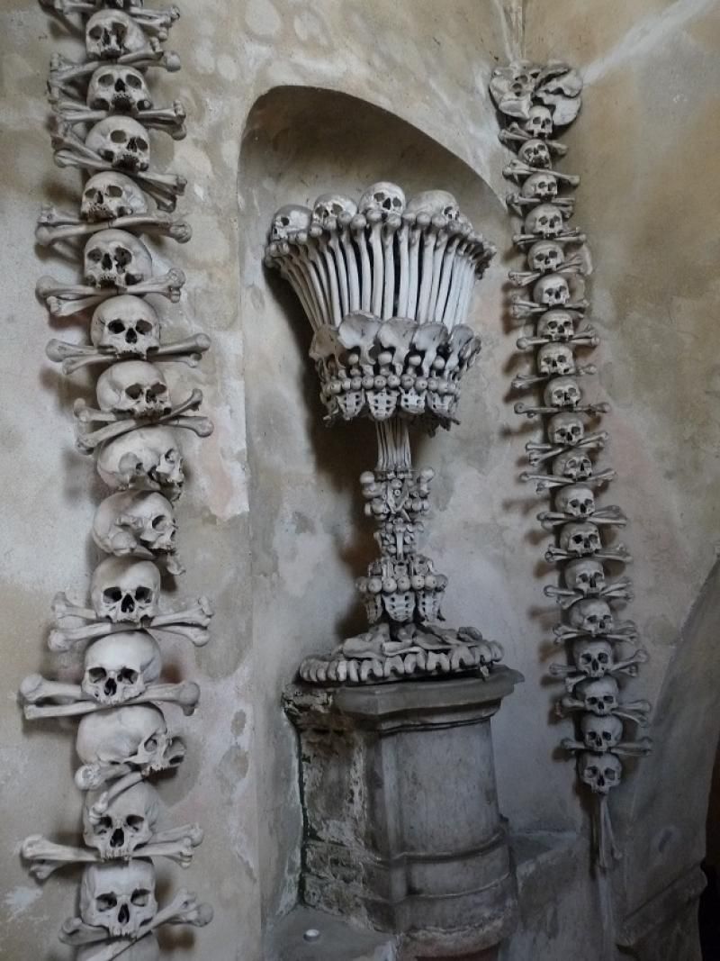 Kilisede görünen her şey insan kemiklerinden yapılmış. Girişteki muazzam avize, avizeler, şamdanlar, zırhlar.. gördğünüz her şey. Bu kemikler, 14.yüzyılın başlarında veba salgınında ve 15.yüzyılın başlarında yapılan Hussite Savaşları'nda ölen insancıklara ait kemikler. Bu iskeletler kilisenin mezarlığında yer alırken, mezarlık kapatıldığında kemikler kilisenin içine alınarak piramitler halinde üst üste yığılmış. 1870 yılında ise Frantisek Rint adındaki bir ahşap oyma ustası özel bir izinle yüzyıllardır mahzende stoklanmış bu kemikler ve kafataslarıyla bu objeleri yapmış.