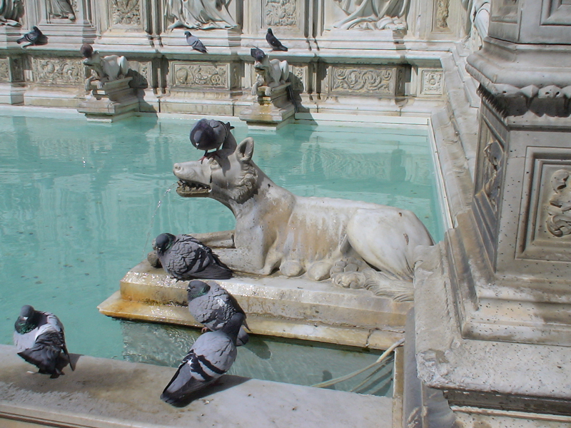 Bu etkileyici meydanın çevresinde kırmızı tuğladan yapılmış ortaçağ binaları dizilmiş. Meydanda bir de Fonte Gaia çeşmesi bulunuyor. Büyük bir havuza akan pek çok çeşme ve çok güzel heykel ve işlemelerle bezenmiş. Havuza akan sular dişi kurtların ağzından akıyor. Havuzdaki heykellerin çoğu ise Romus ve Romulus’u temsil ediyor. Bembeyaz mermer heykellerle süslenmiş, çok güzel bir havuz.