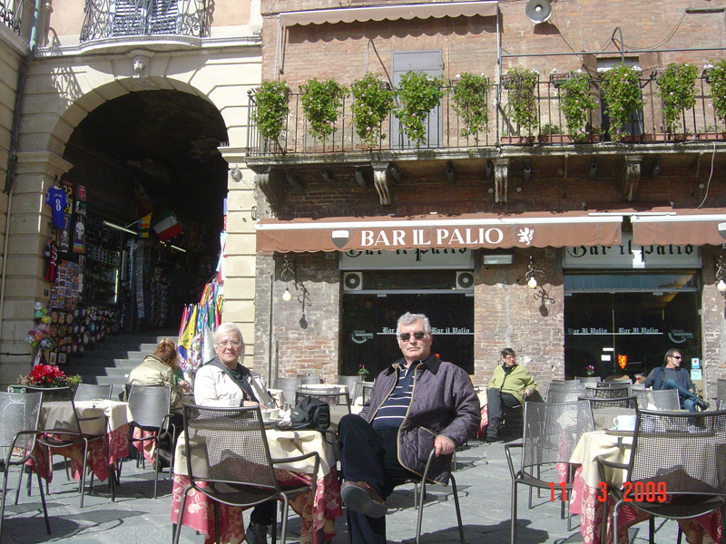 Biz de ortaçağ döneminde kenti gözümüzde canlandırmak ve de biraz dinlenmek için bir kafeye oturuyoruz. Meydanın etrafındaki binaların giriş katları çok hoş kafelerle çevrilmiş. Bu kafelerde Siena’ya özgü, ezme bademden yapılan Ricciarelli bisküvilerinden ve zencefilli çöreklerden yiyebilirsiniz.