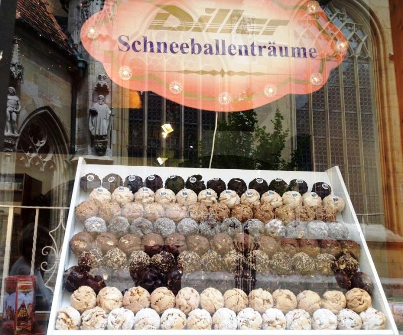 Bir de yiyecek satan işletmeler sizi öyle bir çekiyor ki vitrinlere bakmadan geçemiyorsunuz. Oranın meşhur kurabiyesi olan Schneeballen’den hemen tattık. Bademlisinden tutun da çikolatalısı, fıstıklısı ve daha birçok çeşidi olan bu kurabiyelerden zevkle yedik.