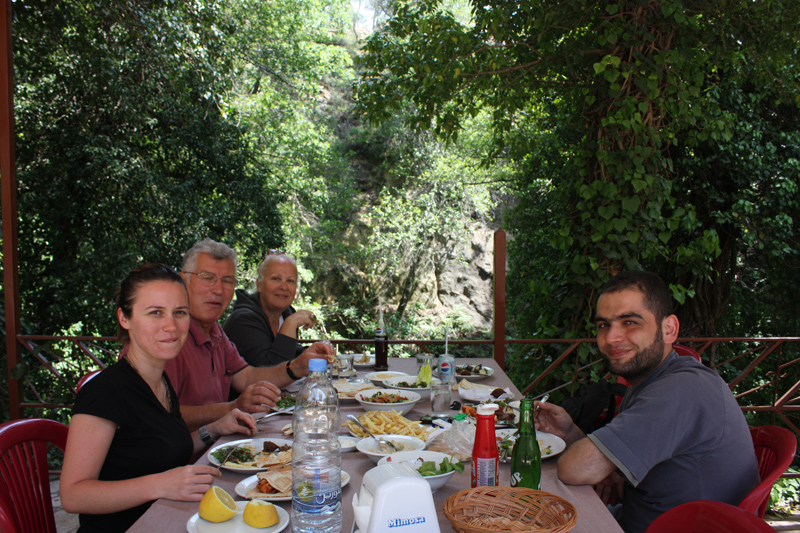 Orman havası iştahımızı açmış olacak ki, hadi artık yemek yiyelim diyoruz. Muhammed de bizi ormanın yakınlarında yine yeşillikler içinde bir kır lokantasına götürüyor. Menü Arapça olduğundan Muhammed bize yardımcı oluyor. Hepimiz farklı birer kebap istiyoruz. Mezelerden de olmazsa olmaz humus, tabulet (bulgurlu maydanoz salatası), bizdeki mevsim salatasına benzeyen fetuş, ve tabii ki babagannuş geliyor masaya. Yemekler gerçekten çok lezzetli. Yemekten konu açılmışken gerçekten ilginç bir şey, Beyrut’ta künefeyi özellikle sabah kahvaltısında yiyorlarmış, içindeki peyniri de diğerlerine göre biraz daha tatlı oluyormuş. Tatlıdan konu açılınca anneme unutturmaya çalıştığımız ünlü S-sweet tatlıları gündeme geliyor ve şehre gidince S-Sweet tatlıcısını ilk durak olarak belirlemek zorunda kalıyoruz.