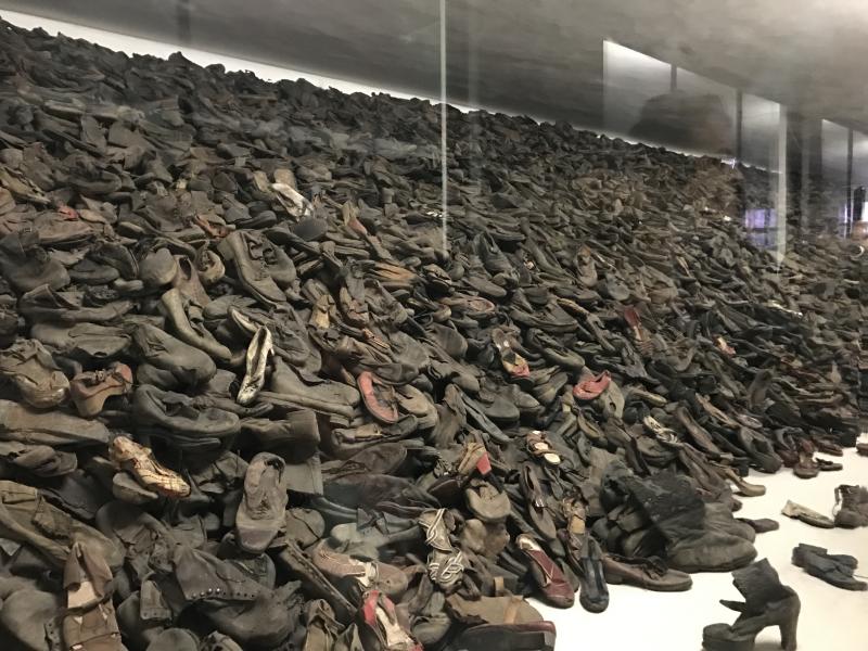 Binalardan birinde Alman hükümetine iletilmek üzere öldürülen tutukluların toplandığı eşyaları görüyoruz. Binlerce ayakkabı, tarak ve fırça, gözlük, özel eşya ve bavul... Bunlar yalnızca bizim görüntüleyebildiklerimiz. Yüzlerce kilo takma altın diş, mücevher ve para çoktan Almanya'ya gittiği için göremediklerimiz ve bir de fotoğraf çekmenin yasak olduğu ve belki yasak olmasa bile çekim yapmaya elimizin varmayacağı çok büyük bir oda dolusu insan saçı. Örgülü kadın saçlarını görmeye yürek zor dayanıyor...