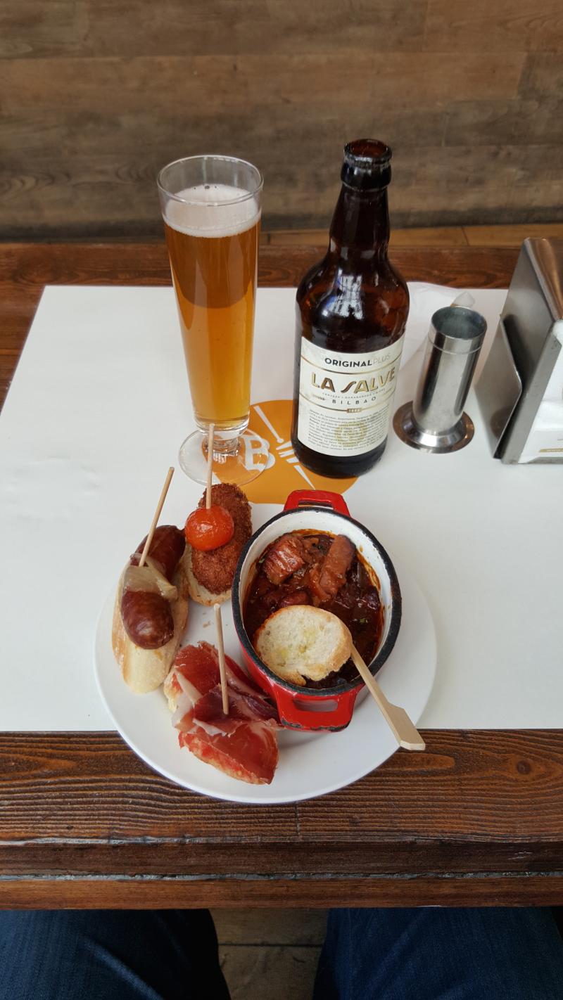 Akşam üstüne doğru katedralin bulunduğu meydandaki Bilbao Berria isimli tapas restoranında yemek molası verdim. Küçük ekmeklerin üzerine kürdanla peynir, et, patates gibi şeyler tutturuyorlar ve bunlara pinchos diyorlar. Tanesi 1.65 Euro ve hepsi çok lezzetli. Ayrıca kendi üretimleri olan bir de biraları var.