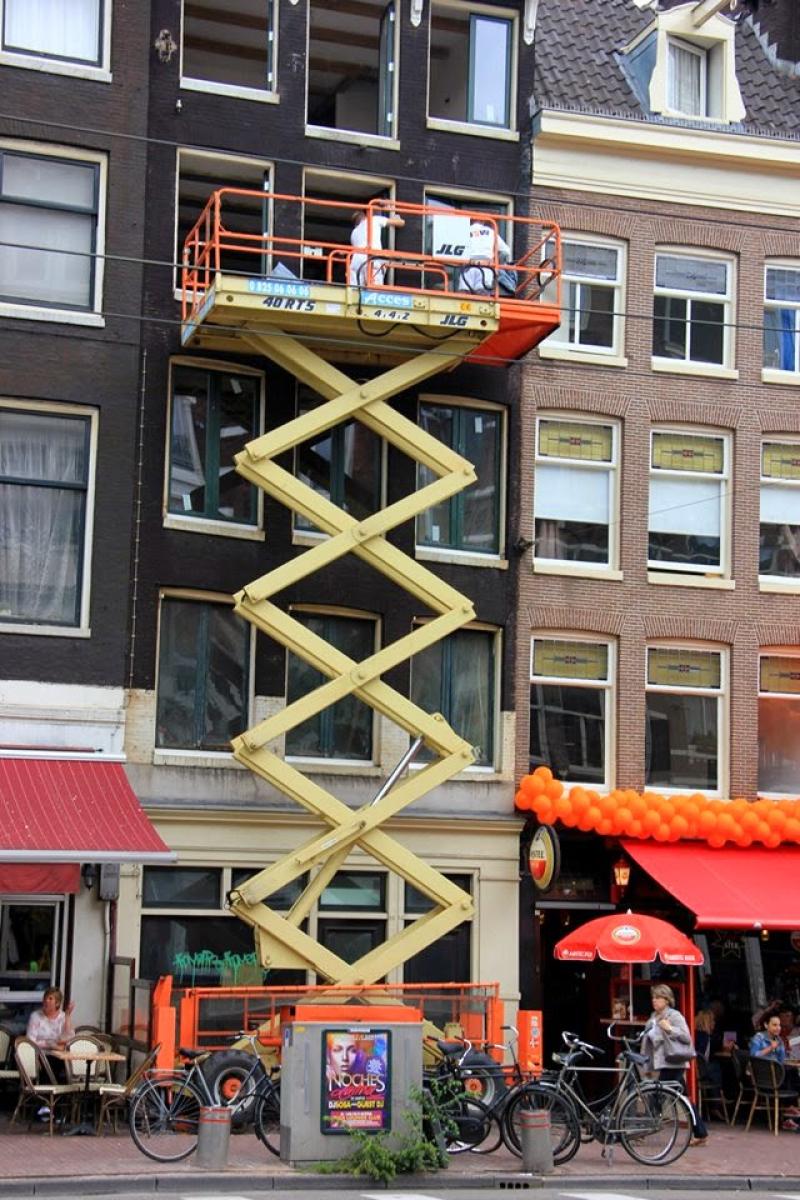 Malları üst katlara çıkarmak için bu çengellere makara bağlayarak çıkartıyorlarmış. Yine evlerin çok dar olması nedeniyle alttaki fotoğrafta olduğu gibi camları çıkarıp bu şekilde dışarıdan eşya taşıması yapıyorlar. Ayrıca evlerin tepesindeki kancalarda Hollanda bayrağı veya okul çantası görürseniz bu evde okulla ilgili iyi bir haberin olduğu anlamına geliyor. Mezun olmak, sınıfını geçmek gibi :)