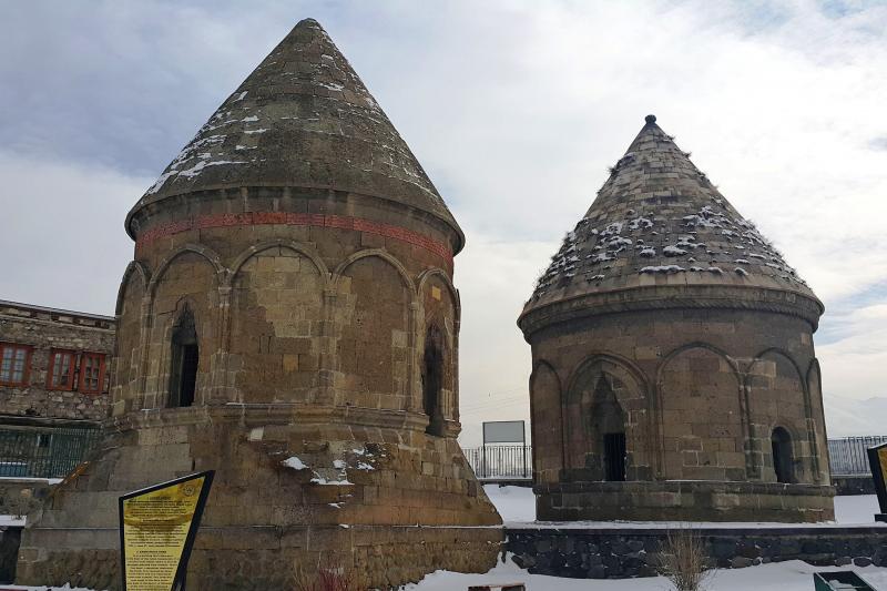Çifte Minareli Medrese’nin ardından hemen arkasında yer alan Üç Kümbetler adlı anıt mezarları görmeye gittik. Bu mezarlardan biri Saltuklu Emirliğinin kurucusu olan Emir Saltuk Bey’e ait. Diğer ikisi ise kimin mezarları olduğu bilinmiyor. Sekizgen olarak inşa edilmiş olan Emir Saltuk Kümbeti’nin üzerinde Çin ve Orta Asya takvimine ait hayvan figürleri yer alıyor.