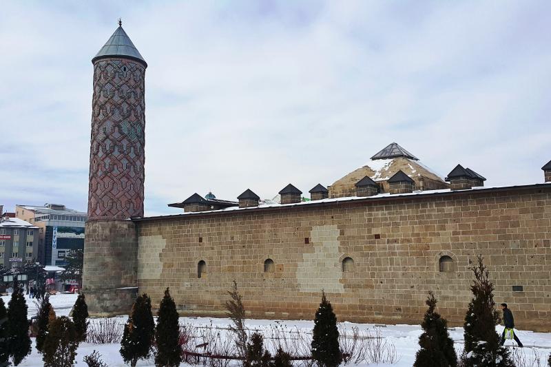 Erzurum gezisini yaptığımız gün hava inanılmaz soğuk olduğundan tabyada sadece 10 dakika kalıp şehrin bir diğer simgesi olan Çifte Minareli Medrese’ye gittik. Malesef medrese tadilatta olduğundan güzel bir fotoğraf alamadım. Medrese yapılırken minareleri tamamlanamamış. Rehberimiz bize neden tamamlanamadığı ile ilgili olan rivayetlerden en bilineni olan usta çırak öyküsünü (Google'da aradığınızda çıkıyor) anlattı. Bu arada medrese 1291 yılında açılmış.