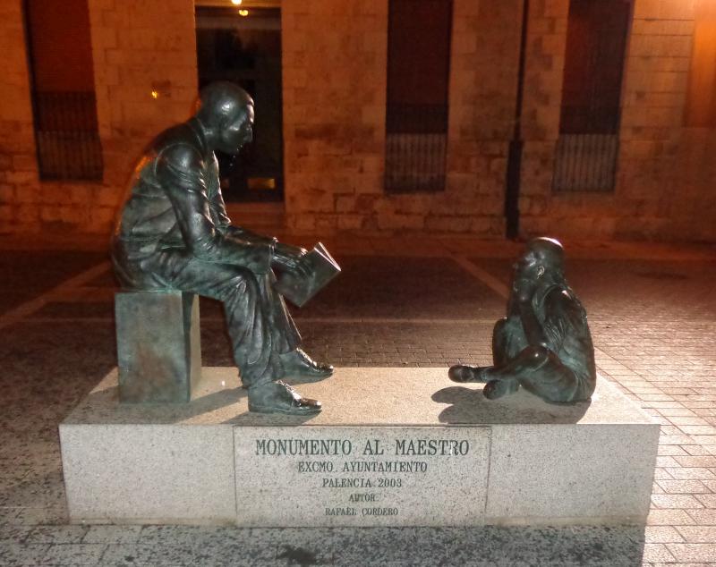 Monumento Al Maestro Palencia Katedrali’ ne çok yakın bir mesafe Cervantes Meydanı’nda yer alan heykel, kitap okuyan bir öğretmen ve onu dinleyen öğrencisini tasvir ediyor.