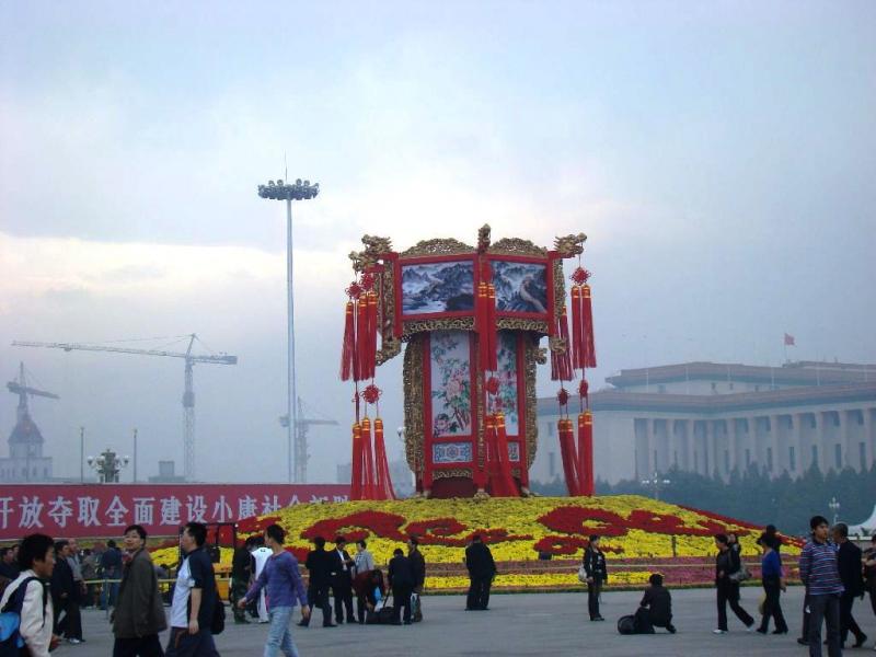 Tiananmen Meydanı - (dünyanın en büyük meydanı) Sarayın bahçesi ve Tiananmen Meydanı’na çıkan kapıları o kadar kalabalık ki birbirimizi kaybetmemek için kol kola giriyor ve “Dağ Başını Duman Almış” marşını söyleyerek birbirimizi kaybetmeden meydana doğru ilerlemeye çalışıyoruz. Oldukça geniş büyük bir meydan burası. Büyük bir panoda 2008 Pekin Olimpiyatları’nın amblemi, 5 kıtayı temsil eden bebekler ve “One World One Dream” tabelası dikkat çekiyor. Mao’nun mezarını ve Parlemanto Binasını da gördükten sonra Cennet Tapınağı (Temple of Haven)’nı görmeye gidiyoruz.
