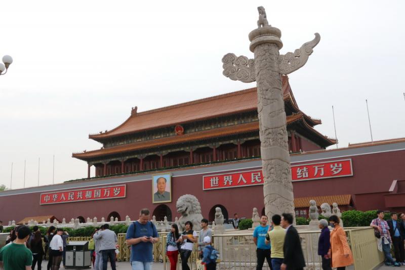Tekrar dönelim Tiananmen Meydanına. Meydanın kuzey tarafında Yasak Şehrin giriş kapısı var. Meridyen ya da Cennet kapısı olarak bilinen kapının Tiananmen meydanına bakan kısmında ise yine Mao’nun resmi var.1420 senesinde yapılmış olan 9,57 metre yüksekliğindeki süslemeli sütunlar da meydana hareket katan unsurlardan.