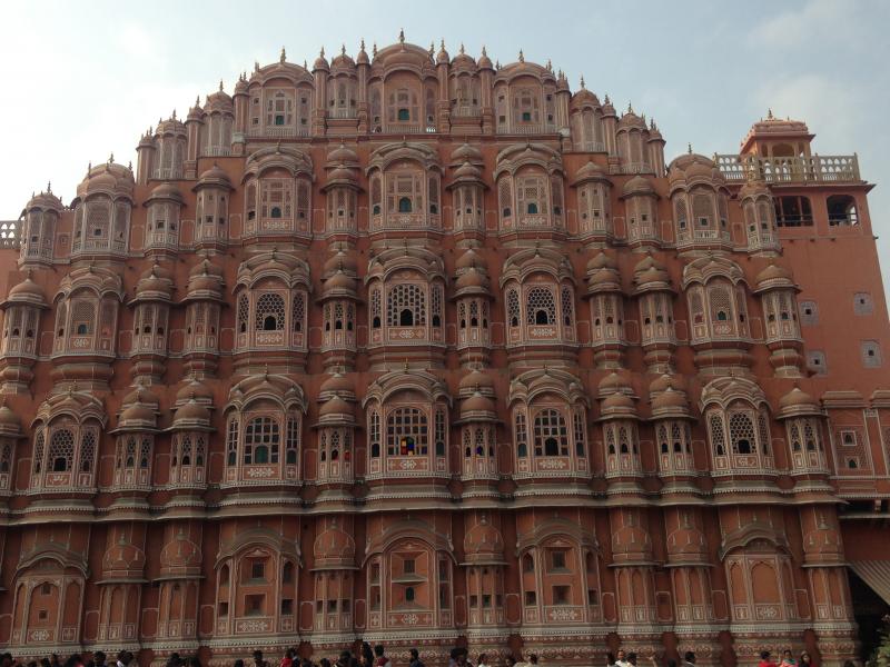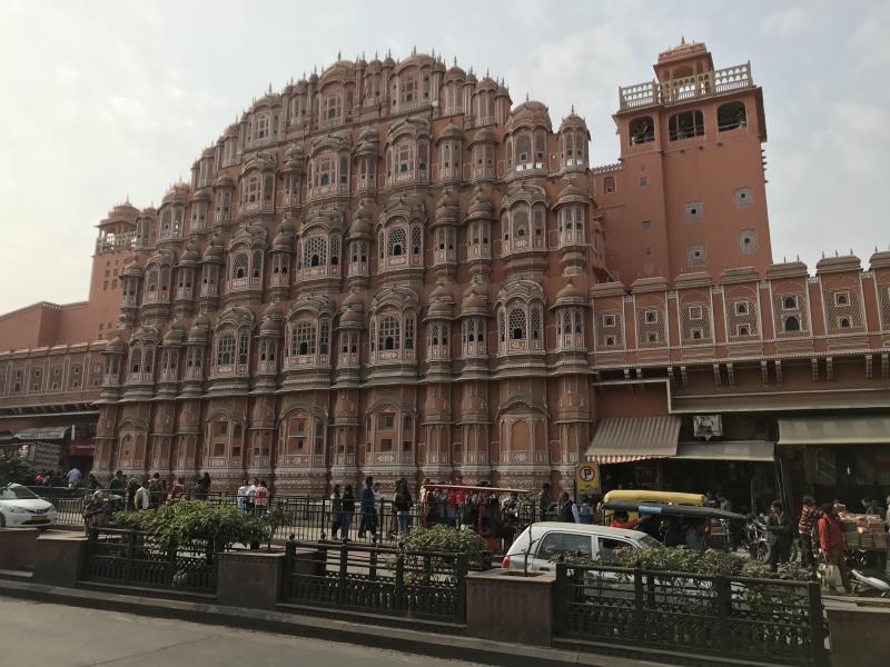 Geniş bir caddeye çıkıyoruz. Bu cadde üzerindeki binalar, şehre verilen pembe şehir isminin de kanıtı. Bir çok güzel bina var ama elbette en güzeli Hawa Mahal (Rüzgar Sarayı). Babür mimarisi ile yapılmış sarayın yapım yılı 1799. Beş katlı ve 953 kemerli muhteşem eserin yapılma nedeni, sarayda yaşayan kadınların sokaktaki şenlikleri, kendileri görülmeden izleyebilmeleridir.