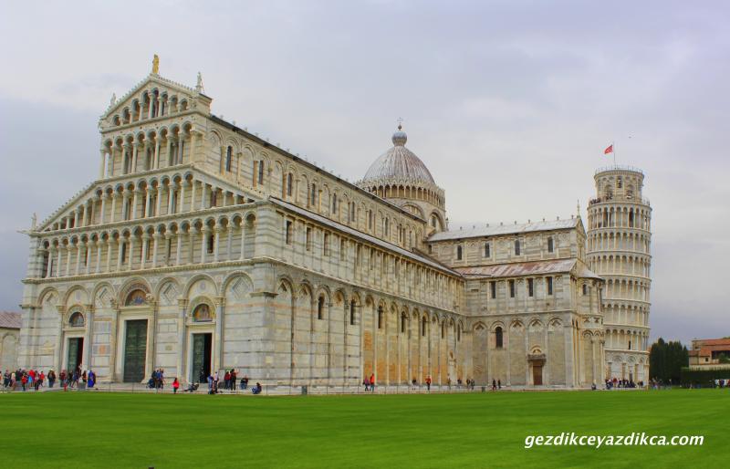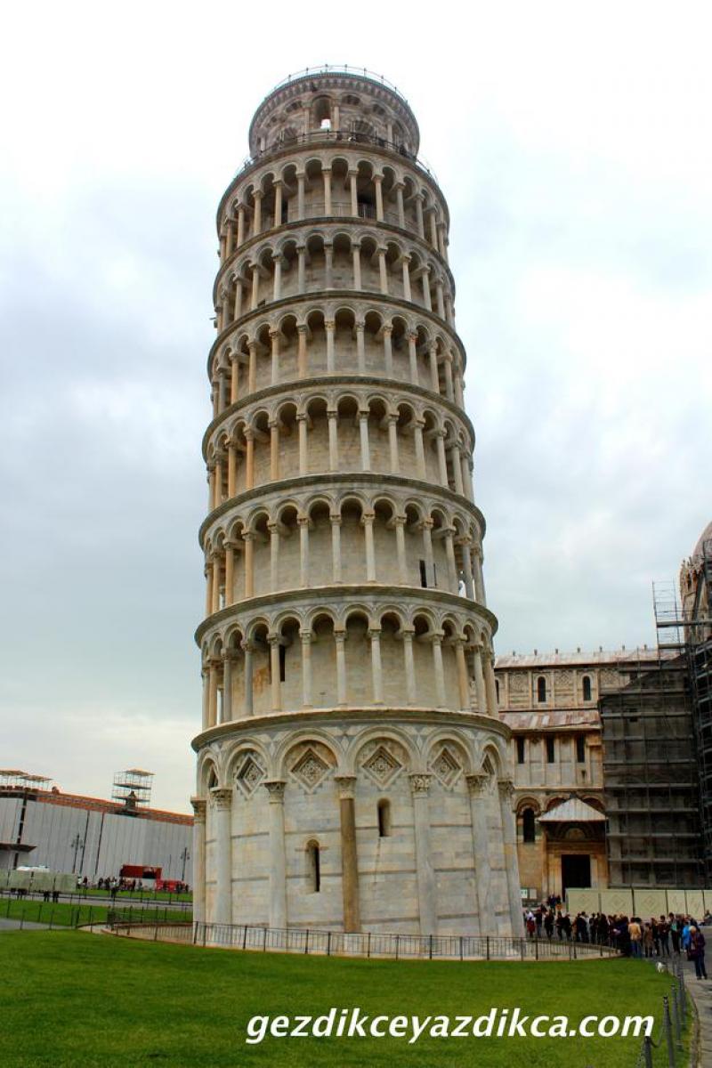 Gelelim bir çok kişinin buraya geliş amacına, Pisa Kulesi dünyada en çok turist çeken yerlerden. Zeminin yumuşaklığından dolayı yapıldığından bu yana eğiliyor. Şu anki eğikliği yaklaşık 4,5 metre kadar. Her yıl milimetrenin onda biri kadar eğiliyormuş. Ancak ağırlık merkezi henüz yapının temel izdüşümü içinde kaldığı için günümüzde hala ayakta.