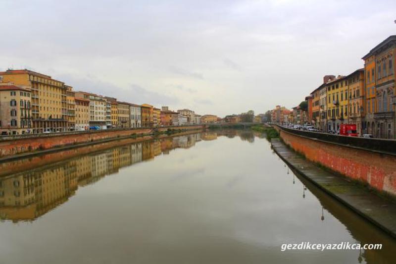 Pisa içinden Arno Nehri'nin geçtiği bir şehir. Evlerin su yüzeyinden bıraktığı yansımalar hoşumuza gidiyor, bu görüntüsü birazda Floransa'ya benziyor. Köprüde biraz oyalanıp bol fotoğraf çekiyoruz.