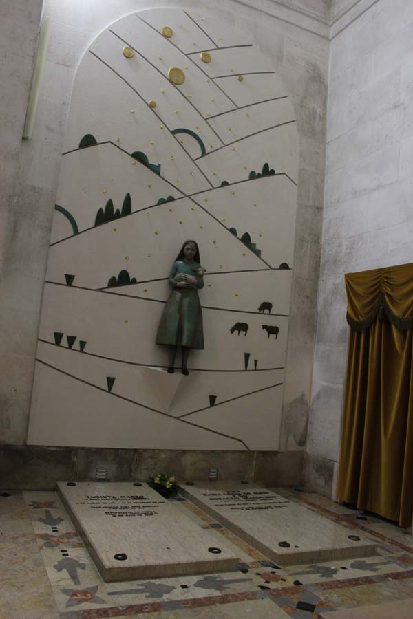 Binanın iç kısmı pembe, gri ve beyaz granit mermerlerle bezenmiş. Ortada Fatima (Lady Rozary) ve çobanlık yapan 3 çocuk, iki yan tarafta da Jesus ve Francesca’nın ve Fatima’nın bilmem kaçıncı reenkarnasyonlarının mezarları. Ben pek çözemedim.