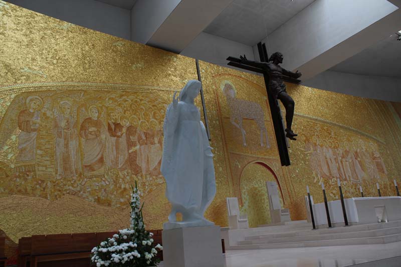 Kiliseden içeriye girdiğiniz anda karşınızdaki duvarda altın renginin hakim olduğu ve havarilerin yer aldığı çok büyük bir mozaik görüyorsunuz. Hemen önünde ise Hz. İsa’nın çarmıha gerilmiş biçimde bir heykeli yer alıyor. Burası mutlaka görülmeli.